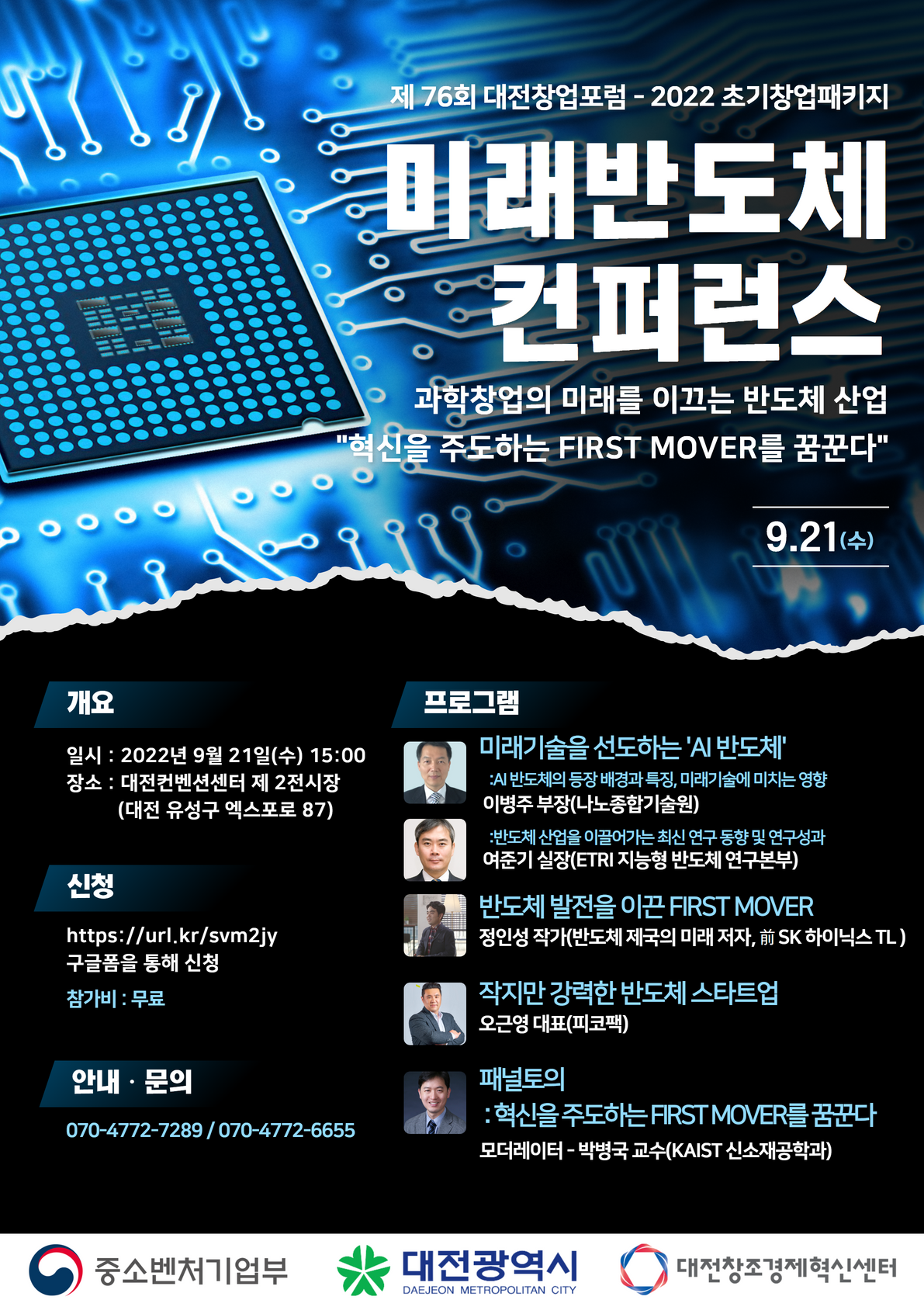 이번 미래반도체 컨퍼런스에서는 대기업/연구소/교육기관/스타트업 등 반도체산업의 다양한 분야에서 활동하고 있는 5명의전문가 패널과 함께 반도체 기술 혁신 사례를 통해 미래기술 발전을 위한 First Mover 전략을 제시하며, AI 반도체의 등장 배경과 특징을 분석하여 미래기술에 미치는 영향을 예측하고, 반도체 산업을 주도하는 최신 연구의 동향과 그간의 연구실적을 알아보고 반도체 스타트업의 성장 전략과 노하우를 공유합니다.