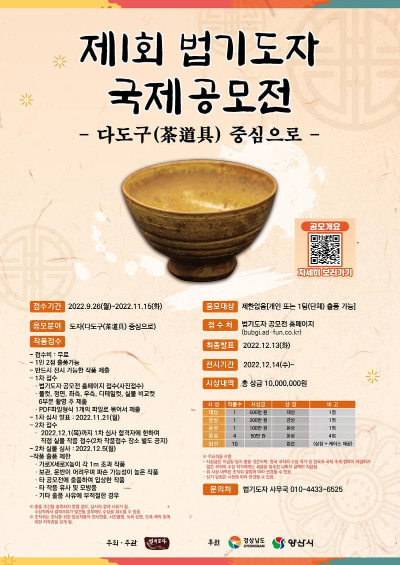 ○ 사 업 명: 제1회 법기도자 국제 공모전 ○ 응모자격 : 제한 없음. [개인 또는 1팀(단체) 출품 가능] ○ 응모분야 : 도자(다도구(茶道具)를 중심으로) ○접수기간 : 2022. 9. 26.(월) \~ 11. 15.(화) ○최종발표 : 2022.12.13.(화) ○시상식 및 전시기간 : 2022. 12. 14.(수)\~ ○ 접수처 : NPO법기도자 공모전 홈페이지(제작 중) ○ 주최 : NPO법기도자 ○ 주관 : NPO법기도자 ○ 후원 : 경상남도, 양산시 ○ 출품접수 : 가. 1인 2점 출품 나. 반드시 전시 가능한 작품 제출 다. 국내외 여행에 결격 사유가 없어야 함 ○ 출품제한 : 가. 가로 X 세로 X 높이 각 1m 초과 작품 나. 보관, 운반이 어려우며 파손 가능성이 높은 작품 다. 타 공모전에 출품하여 입상한 작품 라. 타 작품 유사 및 모방품 마. 기타 출품 사유에 부적절한 경우 ※ 출품조건을 충족하지 못할 경우, 심사의 결격 사유가 됨. 수상작에서 결격사유가 발견될 경우에도 수상을 취소할 수 있음. ※ 조직위는 전시를 위한 입상작품의 전시연출, 사진촬영, 녹화, 상영, 도록제작등에 대한 저작권을 갖게 됨. ○ 출품 접수비 : 무료 ○ 출품 방향 : 온라인 접수 (홈페이지 오픈 예정) (PDF 파일 형식 1개의 파일로 묶어서 제출) (풀컷, 정면, 좌측, 우측, 디테일 컷, 실물 비교 컷 6부문 촬영 후 제출) ○ 작품포장 및 운송 - 제1차 예심을 통과한 작품은 작가 본인 책임아래 모든 포장 및 운송을 진행해야 하며, 그에 따른 경비는 작가가 부담 함. - 작품을 인수받은 시점부터의 모든 운송(전시 디스플레이, 작품의 재포장 및 반출 에 대한 운송)은 NPO법기도자공모전 조직위(이하“조직위”) 책임아래 진행되며 운송경비는 조직위가 부담 함. - 출품자는 작품반입 시 발생할 수 있는 미연의 사고를 방지하기 위해 출품작을 안 전하게 포장하여야 하며, 작품상태보고서를 작성하여 반입운송 전의 작품 상태를 확인ㆍ증명해야함. 조직위는 반입 이전까지 발생한 작품의 훼손 및 파손에 대해 책임지지 않음. - 해외운송의 경우, 작품은 ‘Nail to Nail'방식/ 발송처에서 조직위로 해야함. 세관신고서 및 인보이스 제출은 필수이며 미술품 전문운송사를 통해 운송하지않 을 경우, 통관수수료 및 운송료(세관으로부터 작품접수처까지)등의 비용이 추가로 발생할 수 있으며, 이는 조직위에서 부담하지 않음. - 당선 작품반출은 전시폐막이후 진행되며 작가의 부재로 작품수령이 불가한 경우 조직위에서 책임지지 않음. ○ 작품보험 - 조직위는 작품을 인수받은 시점에서부터 작품 반출이 완료되는 시점까지의 기간 동안 작품안전에 대한 책임이 있으며, 조직위가 해당기간동안 작품안전보험에 가 입할 수 있도록 작가는 반드시 작품설명서에 출품작의 판매가액뿐만 아니라 “보 험가입액”을 별도로 명기함. - 1차 예심을 통과한 작품에 한하여 조직위가 작품을 인수받은 이후 파손이 발생 할 경우, 파손작품의 처리는 조직위와 보험사의 결정에 따라야 함. ○ 유의사항 - 조직위에서 통보한 접수기간 이후에 도착한 작품은 심사대상에서 제외함. - 모든 입상작(전시작)은 제2차 실물작품 심사에서 최종적으로 결정되며, 예심에서 통과한 작품 이미지와 실물작품이 다른 경우 심사위원회의 결정에 따라 제2차 실 물작품 심사에서 탈락할 수 있음. 탈락한 작품은 조직위에 의해 반출됨. - 1차에서 탈락된 작품은 전시 이후 함께 반출될 예정이며 반출일정은 조정할 수 없음. - 심사 이후 표절 시비가 발생할 경우, 재심의 처리에 의거하여 수상을 취소 조치 할 수 있음. - 작품의 디스플레이는 조직위의 책임아래 수행되며, 전시기간 중 작품 반출은 불 가능함. - 위의 사항은 변경될 수 있으며, 변경사항이 발생했을 경우 조직위홈페이지에 공 지됨.