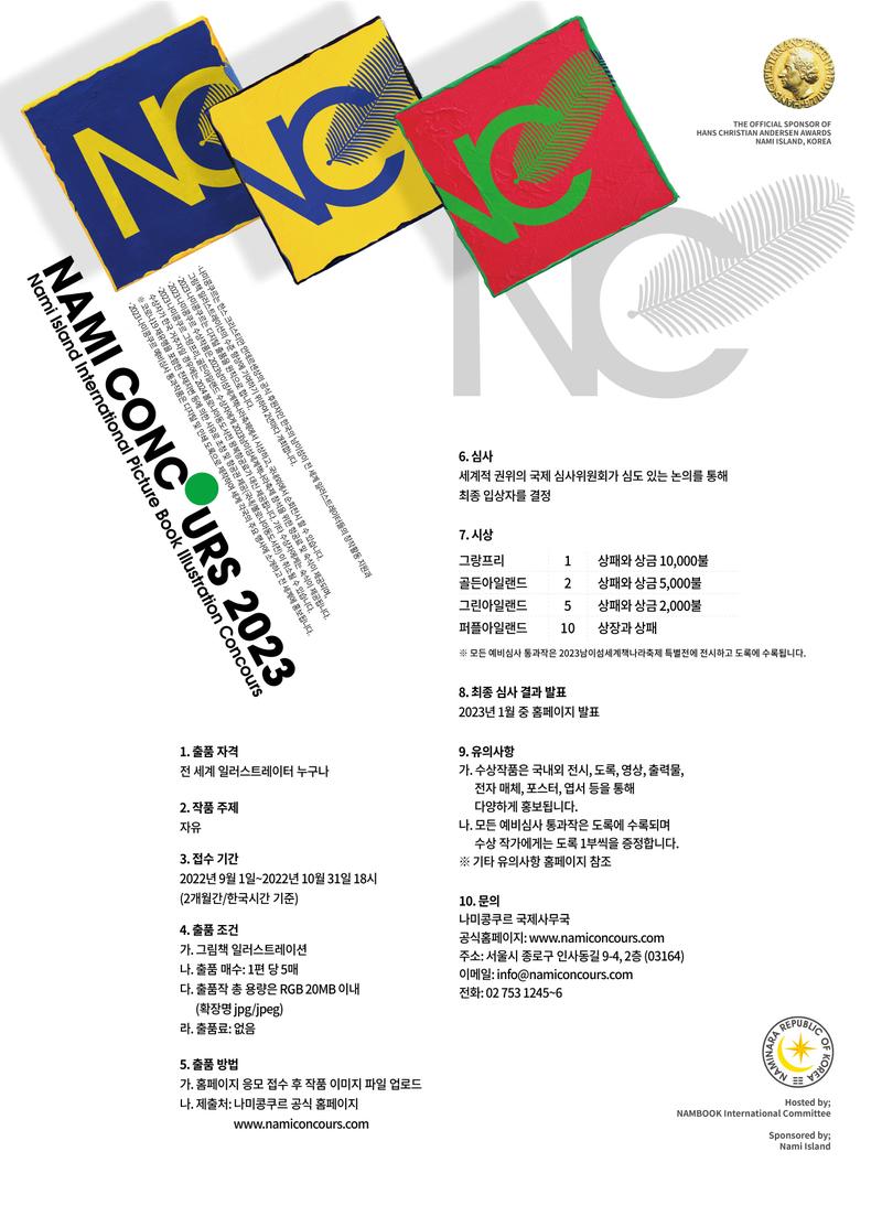 ⦁2023 나미콩쿠르 수상작품은 2023남이섬세계책나라축제에서 시상하고, 국내외에서 순회전시 할 수 있습니다.