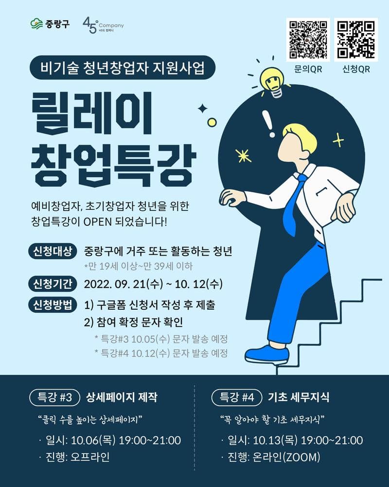 "창업"을 시작한, "창업"에 관심이 있는 중랑구 청년 여러분을 위한 릴레이 창업 특강 10월편이 OPEN 되었습니다!