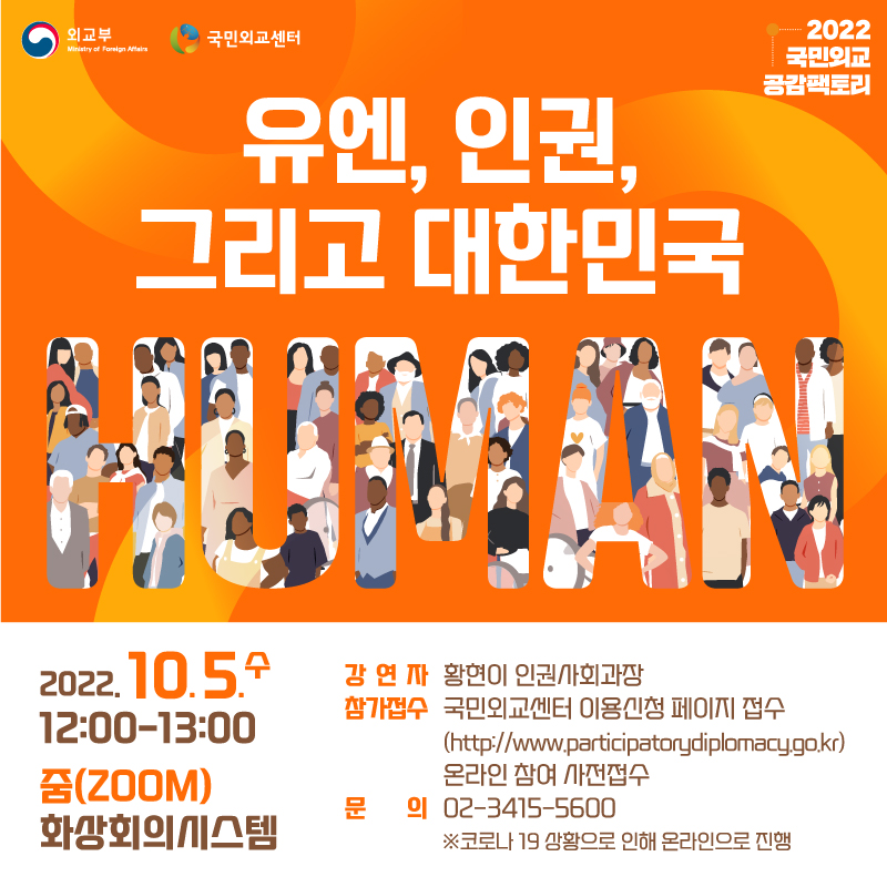 외교부는 10월 5일(수) 12:00-13:00 “유엔, 인권, 그리고 대한민국" 을 주제로 국민외교 공감팩토리를 개최할 예정입니다. 이번 행사는 코로나19 상황으로 인해 온라인으로 진행될 예정입니다. 국민 여러분의 많은 관심과 참여를 부탁드립니다. ㅇ일시 : 2022년 10월 5일(수), 12:00-13:00