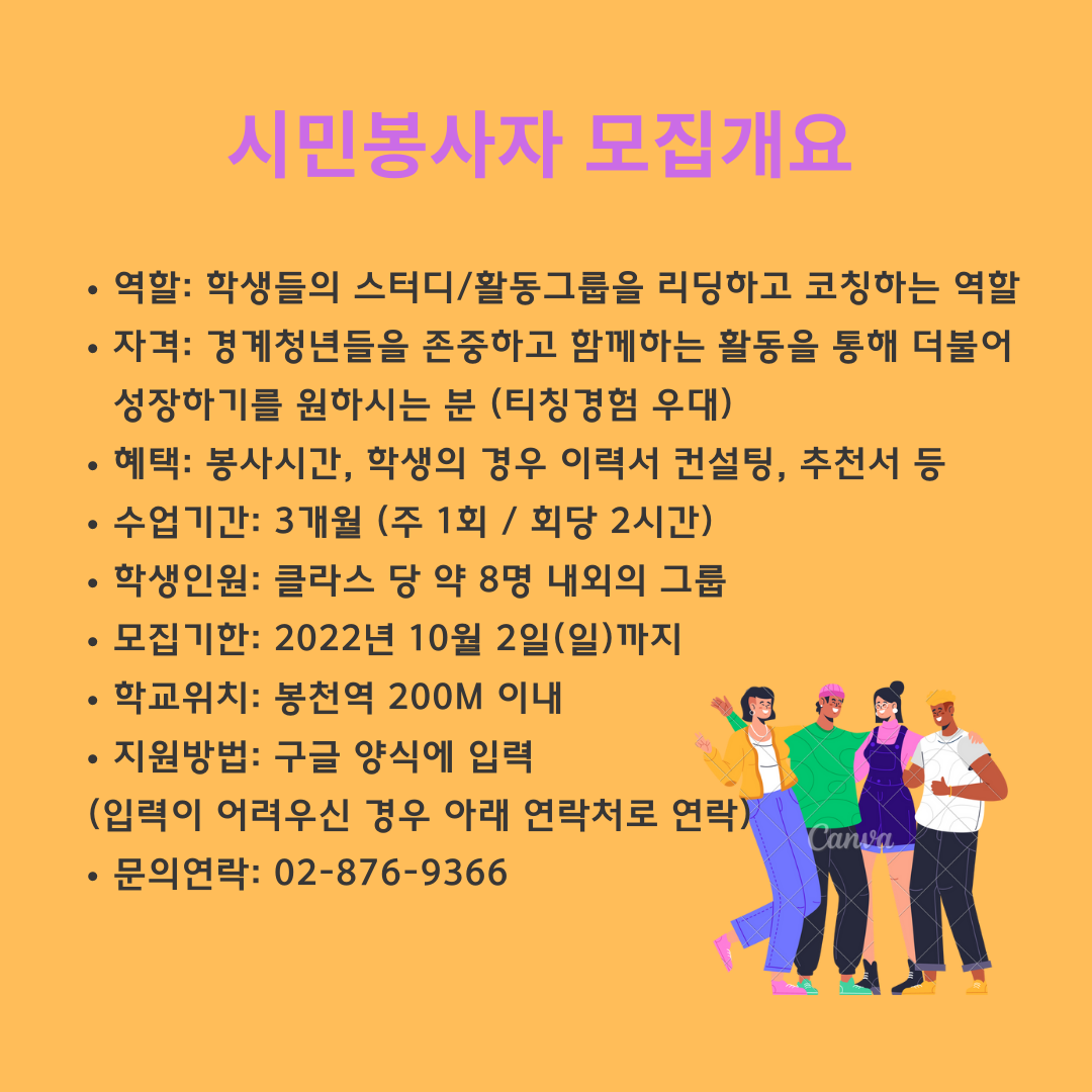ㅇ 자격: 경계청년들을 존중하고 함께하는 활동을 통해 더불어 성장하기를 원하시는 분 (티칭경험 우대)