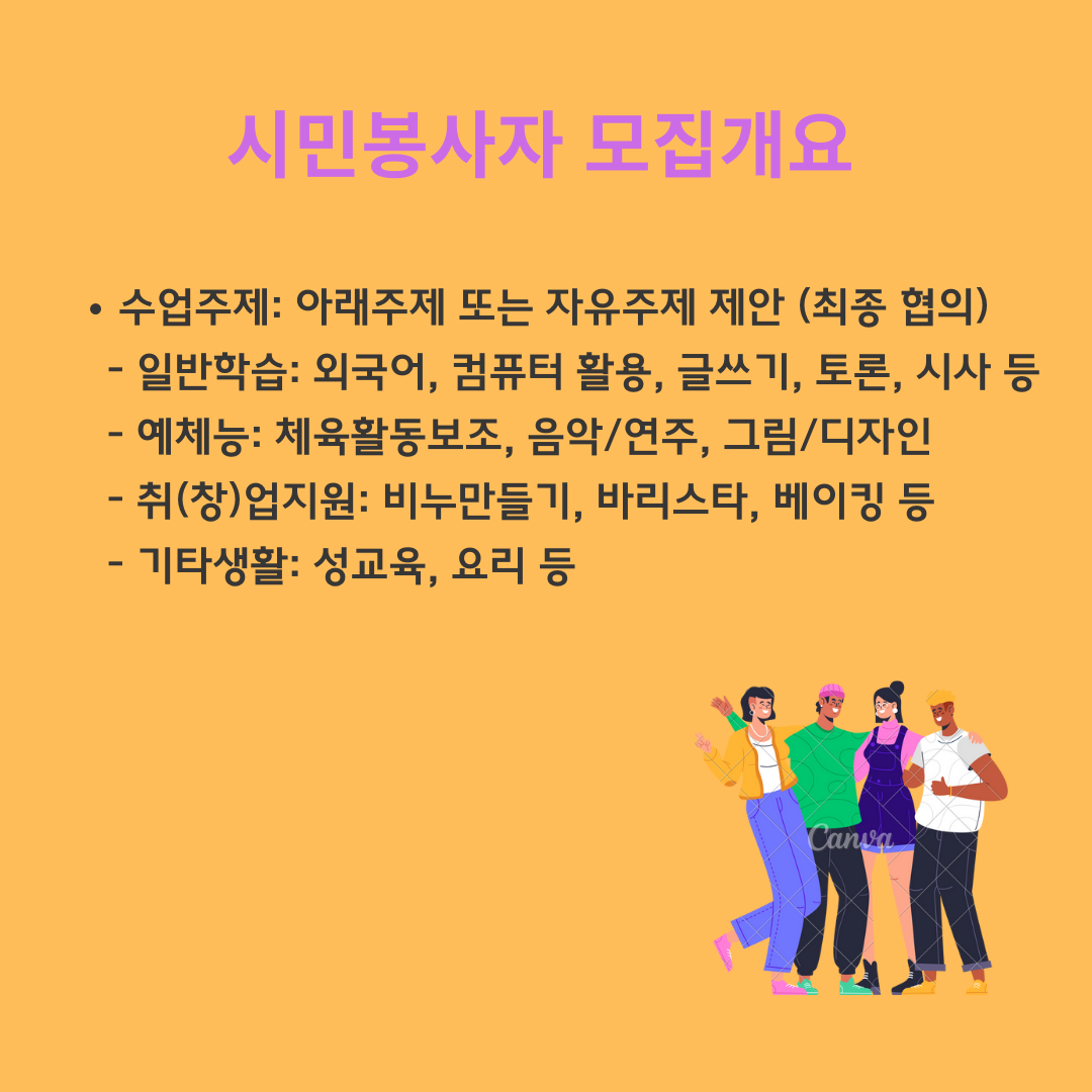 ㅇ 혜택: 봉사시간, 학생 봉사자의 경우 취업 시 이력서 컨설팅, 우수활동자의 경우 추천서 등