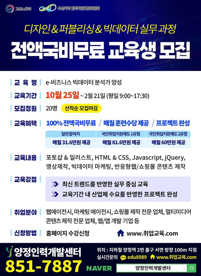 신청 방법 : 양정인력개발센터 홈페이지(https://www.jobyj.co.kr/) 수강신청 또는 051-851-7887 유선 연락해주세요^^