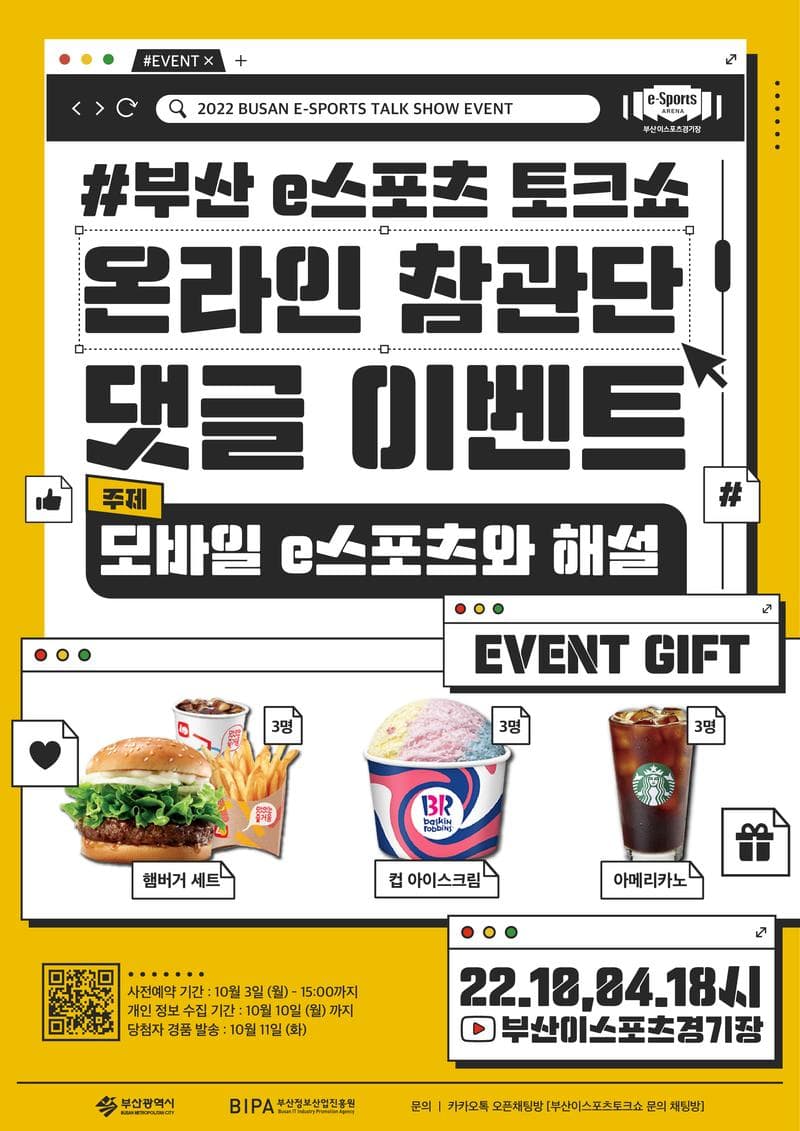 - 2022 부산 이스포츠 토크쇼 유튜브 스트리밍 진행 중 토크쇼에 대한 시청 소감이나 하고 싶은 말을 댓글로 작성하면 추첨을 통하여 푸짐한 경품이 팡팡!