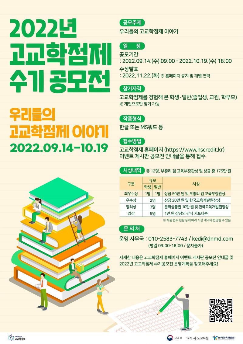 2022 고교학점제 수기 공모전, 우리들의 고교학점제 이야기 ●공모개요 교육부와 한국교육개발원에서는 2025년 고교학점제의 본격 시행을 준비하며, 고교학점제에대한 학생, 교사, 학부모님들의 생각을 공유하고 우수한 사례를 확산하고자 ‘2022년 고교학점제 수기 공모전’을 개최합니다. 많은 관심과 참여 부탁드립니다. ●일정 - 공모기간 : 2022.09.14.(수) 09:00 \~ 2022.10.19.(수) 18:00 - 수상발표 : 2022.11.22.(화) ※ 홈페이지 공지 및 개별연락 ●공모주제 - 우리들의 고교학점제 이야기 ●참가자격 고교학점제를 경험해 본 학생 또는 일반 - 학생 : 일반계고(고교학점제 연구, 선도학교 포함)에서 고교학점제를 미리 경험해 본 재학생 - 일반 : 일반계고(고교학점제 연구, 선도학교 포함)에서 고교학점제를 미리 경험해 본 졸업생, 교원, 학부모 ※ 공동 수기는 불가하며, ‘개인’으로만 참가 가능 ●접수방법 고교학점제 홈페이지(https://www.hscredit.kr)에서 이벤트 게시판을 통하여 접수. ※ 참가신청서, 개인정보 수집·이용 및 제공 동의서, 청렴 서약서를 다운로드 후 작성 ※ 이벤트 게시판 바로가기 : (https://www.hscredit.kr/news/eventDetail.do?seq=3515&pageNo=1) ●시상내역 총 12명, 부총리 겸 교육부장관상 및 상금 총 175만원