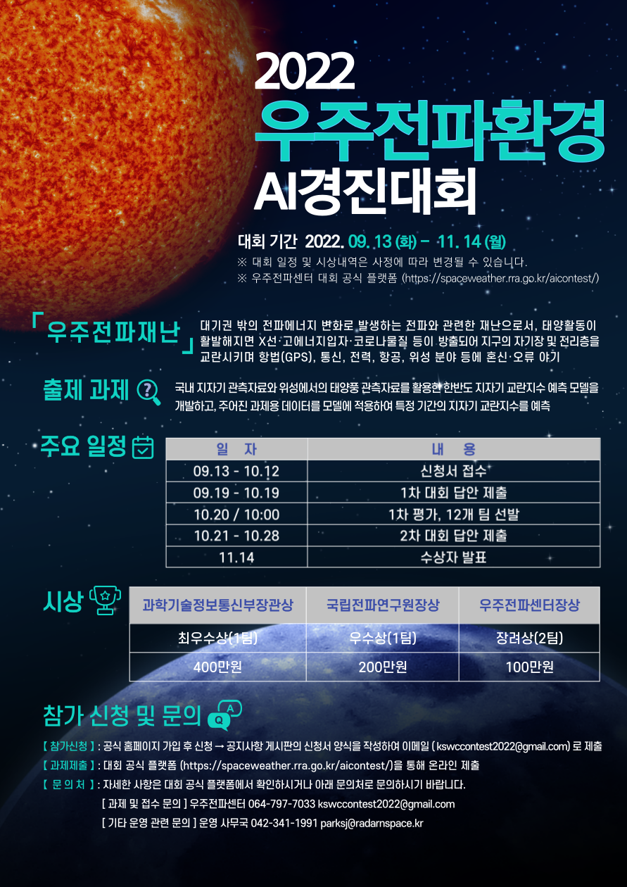 ● 기간 및 일정 - 참가 신청 접수: 9.13.\~10.12. - 1차 답안 제출 기간: 9.19.\~10.19. 23:59 - 1차 입선팀(12팀) 발표: 10.20. 10:00 - 입선팀 대상 2차 문제 데이터 제공: 10.21. 10:00 - 2차 답안 제출 기간: 10.21.\~10.28. 23:59 - 경진대회 수상자 발표: 11.14. 15:00 - 시상(예정): 12.1. ● 출품규격 - 답안 제출 기간 이내라면 몇 번이든 답안을 제출할 수 있으며\, 가장 최근에 제출한 답안을 평가 대상으로 함 - (1차 평가) 60일간의 일별 국내 지자기 교란지수 예측값 산출 결과를 플랫폼을 통해 제공하는 답안 양식에 맞춰 .xlsx 파일로 제출 ● 응모 일정 - ‘22. 9. 13. \~ ’22. 10. 12. 24:00(선착순 60팀) ● 제출 방법 - 60일간의 일별 국내 지자기 교란지수 예측값 산출 결과를 플랫폼을 통해 제공하는 답안 양식에 맞춰 .xlsx 파일로 제출 - 답안 제출 기간 이내라면 몇 번이든 답안을 제출할 수 있으며\, 가장 최근에 제출한 답안을 평가 대상으로 함 ● 접수 방법 ① 우주전파센터 AI 경진대회 홈페이지(https://spaceweather.rra.go.kr/aicontest)에서 회원가입 후 참가 신청 ② 참가 동의서, 개인정보 수집·이용·제공 동의서 등 부대서류 작성 후 이메일(kswccontest2022@gmail.com)로 제출 ⇒ 센터는 신청서 확인 후 개발환경 접속경로(IP, 비밀번호)를 대표자에게 전송 ③(신청 서류) 참가신청서, 개인정보 수집·이용 및 제3자 제공 동의서, 참가자 서약서 각 1부 - 서식은 경진대회 홈페이지(https://spaceweather.rra.go.kr/aicontest) ‘공지사항’ 게시판에서 다운로드 ● 심사 방법 - 모델 재현성 검증 결과를 포함한 2차 평가 결과를 검토하고 최종 수상자를 확정하기 위해 심사위원회를 구성하여 최종 심사 수행 ● 유의 사항 - 홈페이지에서 참가 신청 시 선택한 개발환경(Python\, Rstudio)과 참가신청서상 신청사항이 불일치할 경우 개발환경 부여가 지연될 수 있음 ● 문의 사항 ❍ (과제 및 접수 관련 문의) 우주전파센터 유재혁 주무관(kswccontest2022@gmail.com, 064-797-7033) ❍ (대회 운영 관련 문의) 레이다앤스페이스 박세진 과장(parksj@radarnspace.kr, 042-341-1991)
