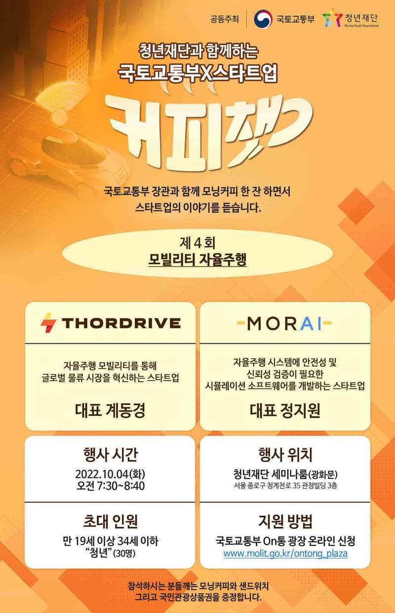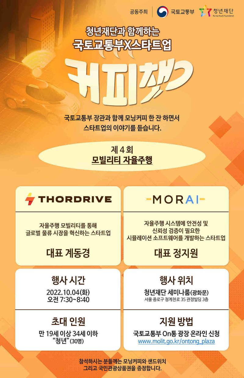 ✅커피챗이 소개할 스타트업 1) 자율주행 모빌리티를 통해 글로벌 물류 시장을 혁신하는 스타트업 "THORDRIVE" 계동경 대표 2) 자율주행 시스템에 안전성 및 신뢰성 검증이 필요한 시뮬레이션 소프트웨어를 개발하는 스타트업 "MORAI" 정지원 대표 ✅행사시간 2022.10.04.(화) 오전 7:30\~8:40