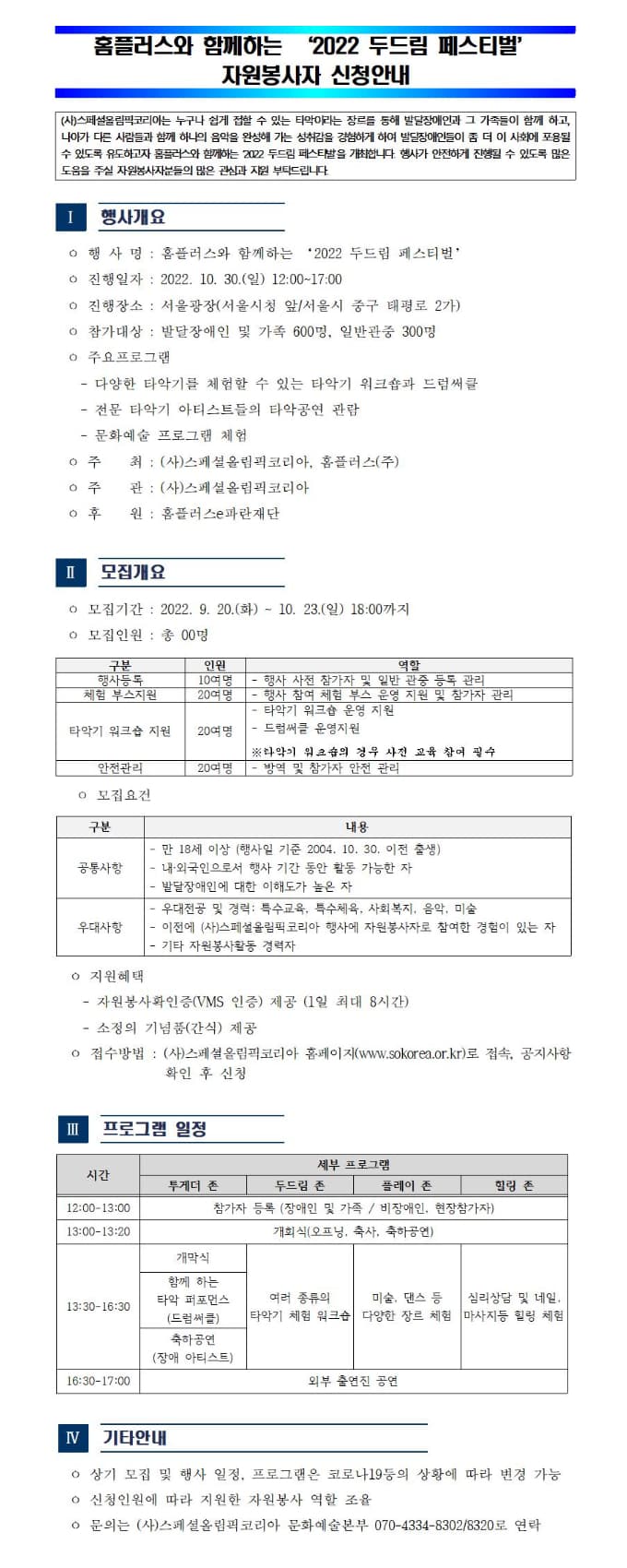 (사)스페셜올림픽코리아는 누구나 쉽게 접할 수 있는 타악이라는 장르를 통해 발달장애인과 그 가족들이 함께 하고, 발달장애인들이 좀 더 이 사회에 포용될 수 있도록 유도하고자 홈플러스와 함께하는 ‘2022 두드림 페스티벌’을 개최합니다. 행사가 안전하게 진행될 수 있도록 많은 도움을 주실 자원봉사자분들의 관심과 지원 부탁드립니다. □ 행사개요 ○ 행사일시 : 2022년 10월 30일 일요일 12시\~17시 ○ 행사장소 : 서울광장(서울시 중구 태평로 2가) ○ 주요행사 : 타악기 워크숍과 드럼써클, 타악공연 관람, 문화예술 프로그램 체험 □ 모집요강 ○ 모집기간 : 2022년 9월 20일(화) \~ 10월 23일(일) ○ 신청방법 : https://forms.gle/5uSsW7RBMg3m7o2e8 ○ 모집대상 : 자원봉사자 00명 ○ 활동내용 - 행사등록 - 부스 체험 관리 - 타악기 워크숍 지원 - 안전관리 ※ 자세한 내용은 스페셜올림픽코리아 공지사항(https://sokorea.or.kr)을 확인해주세요. ※ 문의사항 : 문화예술본부 070-4334-8302