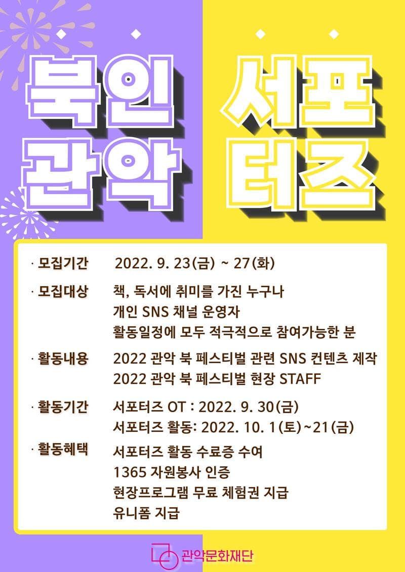 2022 관악 북 페스티벌 「Book In Gwanak Festival」 서포터즈 모집 관악문화재단에서 책을 매개로 소통할 수 있는 독서문화축제 ‘2022 관악 북 페스티벌(B.I.G)’ 의 서포터즈를 모집합니다. [모집일정] 접수기간 : 2022. 9. 23(금) \~ 9. 27(화) 24:00 발표일 : 2022. 9. 28(수) 개별연락 예정 [지원자격] 책, 독서에 취미를 가진 누구나 개인 SNS 채널 운영자 (블로그, 인스타, 유튜브 등) 서포터즈 활동일정에 모두 적극적으로 참여가 가능한 분 [모집인원] 20명 [활동내용] 2022 관악 북 페스티벌 관련 SNS 홍보 컨텐츠 제작 2022 관악 북 페스티벌 현장 STAFF [활동일정] 서포터즈 OT : 2022. 9. 30(금) 16:00 / 싱글벙글교육센터 1층 서포터즈 활동 : 2022. 10. 1(토) \~ 10. 25(화) [활동혜택] 관악문화재단 [2022 관악 북 페스티벌] 서포터즈 활동 수료증 수여 1365 자원봉사 인증 2022 관악 북 페스티벌 현장프로그램 무료 체험권 지급 2022 관악 북 페스티벌 유니폼 지급 [접수방법] 구글 폼을 통한 지원서 작성 및 제출 https://forms.gle/FxYMfSJWowPRmEZz5 자세한 내용은 관악문화재단 홈페이지 또는 블로그를 참고해주시기 바랍니다. 문의 – T. 02-889-5633 E. wlsdk@gfac.or.kr *서포터즈 활동 컨텐츠는 관악문화재단 [2022 관악 북 페스티벌] 관련 자료로 활용될 수 있습니다.