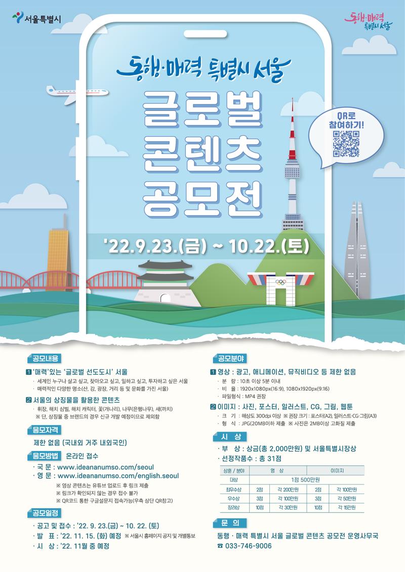 서울특별시에서는 ‘동행·매력 특별시 서울’을 위한 글로벌 콘텐츠 공모전을 실시합니다. 세계인이 누구나 살고 싶고, 찾아오고 싶고, 일하고 싶고 투자하고 싶은 서울의 모습과 매력을 표현해 주세요. 관심 있는 분들의 많은 참여 바랍니다.
