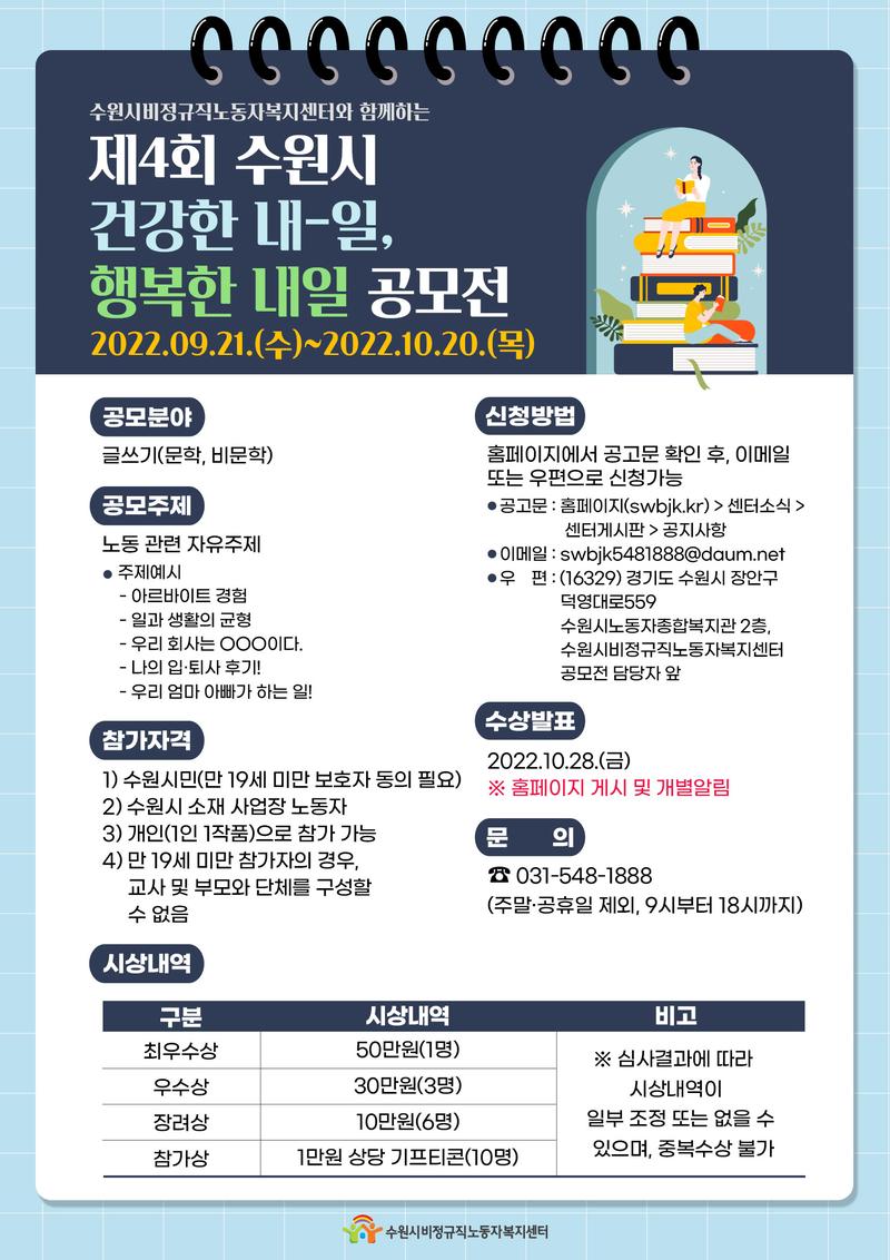 1. 공모개요 ○ 공 모 명 : 제4회 수원시 건강한 내-일, 행복한 내일 ○ 공모분야 : 글쓰기(문학, 비문학) ○ 공모기간 : 2022.09.21.(수)\~2022.10.20.(목) ○ 접수기간 : 2022.09.21.(수)\~2022.10.20.(목) ○ 심사기간 : 2022.10.20.(목)\~2022.10.27.(목) ○ 수상발표 : 2022.10.28.(금) ○ 공모주제 : 노동 관련 자유주제 ∙ 주제예시 - 아르바이트 경험 - 일과 생활의 균형 - 우리 회사는 ○○○이다. - 나의 입·퇴사 후기! - 우리 엄마·아빠가 하는 일!