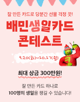 ■ 이벤트개요 최대상금 300만원! 잘 만든 카드 하나로 100명의 생일을 고민없이 챙길 수 있습니다! 2번째 생일을 맞은 배민선물하기에게 예쁜 생일카드를 선물해주세요