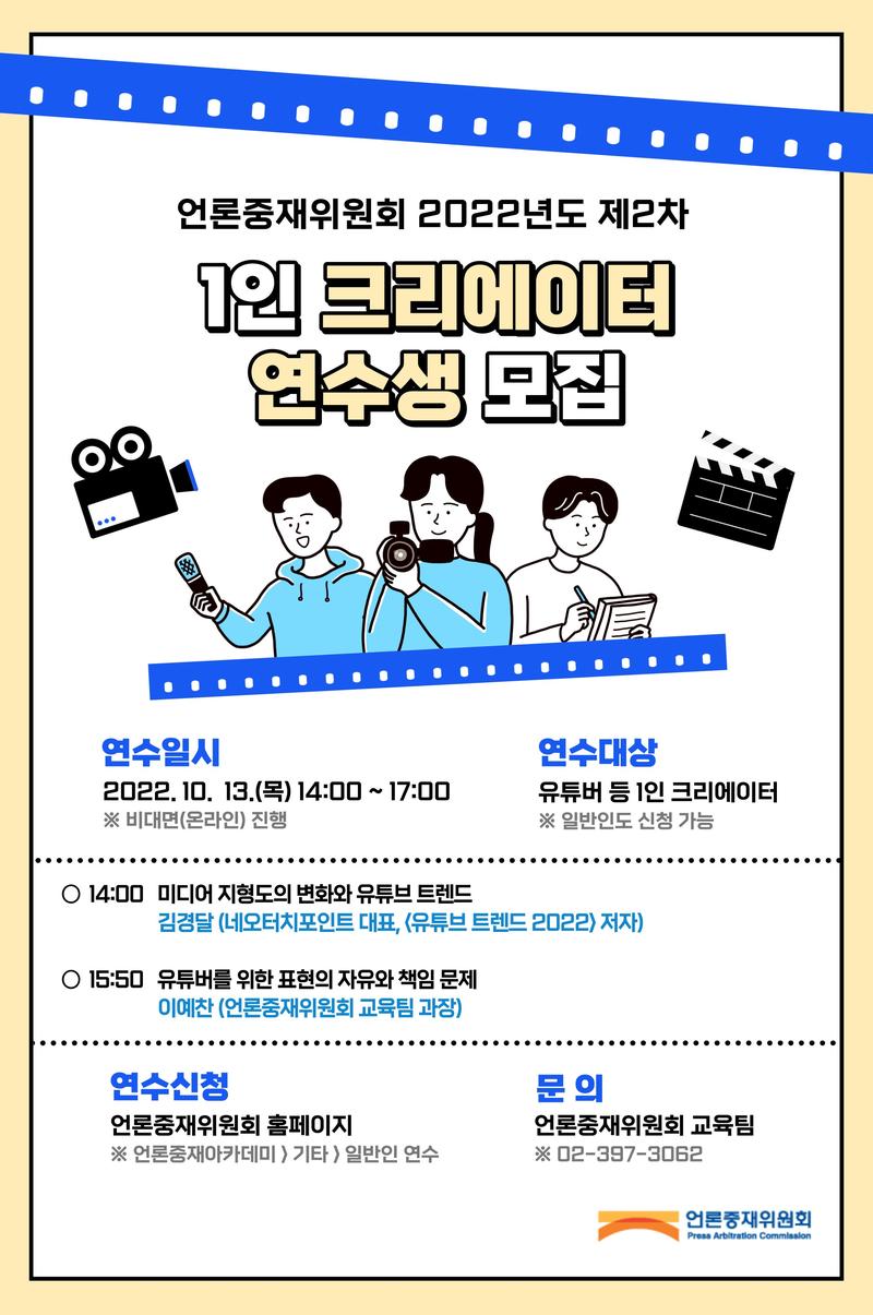 안녕하세요. 언론중재위원회 교육팀입니다. 변화한 미디어 환경 속에서의 최신 유튜브 트렌드가 궁금하신가요? 유튜브상 표현의 자유는 어디까지 허용되는지 알고 싶으신가요? 그렇다면 이번 연수를 신청하세요. 유튜브 채널을 운영 중이시거나 크리에이터를 꿈꾸는 일반인까지 알면 유익한 정보를 얻어 가실 수 있습니다. 특히 이번 연수를 위해 <유튜브 트렌드 2022>의 저자 김경달 네오터치포인트 대표님을 강사로 어렵게 모셨습니다. 연수는 무료로 진행되며, 성실히 참석하신 분(85% 이상 수강)들께는 이수증을 발급해 드립니다.