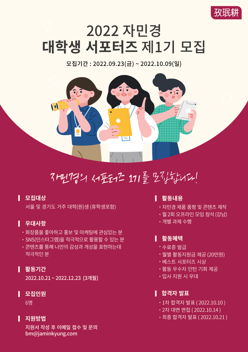 🍀모집 일정 접수 기간: 2022.09.23.(금) - 2022.10.09.(일) 접수 방법: 지원서 작성 후 이메일 지원 (bm@jaminkyung.com) 1차 합격 발표: 2022.10.10(월) 대면 면접: 2022.10.14(금) 최종 합격 발표: 2022.10.17(월) 발대식: 2022.10.21 🍀활동 내용 자민경 제품 품평 및 콘텐츠 제작 오프라인 모임 참석 (월 2회) 개별 과제 수행: 자신이 관심있는 분야의 콘텐츠 제작