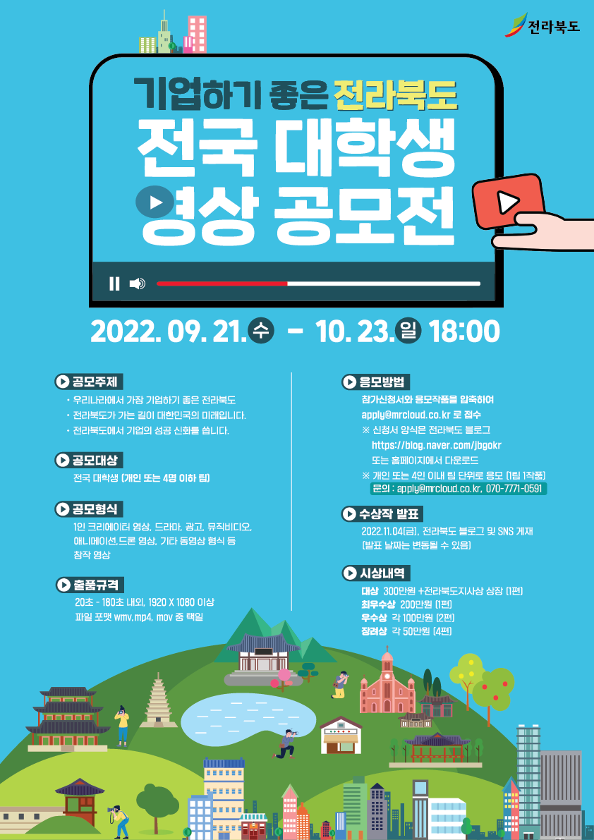 ◆ 공모 주제 -우리나라에서 가장 기업하기 좋은 전라북도 -전라북도가 가는 길이 대한민국의 미래입니다 -전라북도에서 기업의 성공 신화를 씁니다 ◆ 응모 일정 -모집 기간: 2022.09.21(수)\~10.23(일) 18:00 -수상작 발표: 2022년 11월 4일(금), 전라북도 블로그 및 SNS 게재 ※ 수상작 발표 날짜는 변동될 수 있음 ◆ 공모 대상 -전국 대학생 (개인 또는 4명 이하 팀) -개인 또는 4인 이내 팀 단위로 응모 (1팀 1작품) ◆ 공모 형식 1인 크리에이터 영상, 드라마, 광고, 뮤직비디오, 애니메이션, 드론 영상, 기타 동영상 형식 등 창작 영상 ◆ 작품 규격 20초\~180초 내외, 1920*1080 이상 파일 포맷 wmv, mp4, mov 중 택일 ◆ 응모 방법 참가신청서와 응모작품을 압축하여 이메일(apply@mrcloud.co.kr)로 접수 -신청서 양식은 전라북도 블로그(https://blog.naver.com/jbgokr/222879705697) 또는 홈페이지에서 다운로드 ◆ 유의 사항 - 응모자의 작품이 아닌 타인의 작품(표절, 도용 등의 경우). - 타 공모전에서 제출되었거나 이미 수상경력이 있는 작품. - 지적재산권(음원, 영상, 이미지, 일러스트, 서체 등) 침해 작품. - 제3자에 대한 초상권 및 타인의 명예를 훼손한 작품. - 공모 취지에 적합하지 않은 상업성 작품. ※ 입상 이후에라도 관련 사실이 밝혀질 경우 수상은 취소되며, 분쟁에 대한 모든 민․형사상의 법적 책임은 응모자에게 있음. ※ 시상금에 대한 제세공과금은 제외되어 지급. ※ 접수된 서류 및 동영상 작품 등은 일체 반환 되지 않음. ※ 출품작은 주최 측의 홍보목적으로 활용할 수 있고, 수상작에 대한 저작권 및 소유권은 주최 측에 있음. ◆ 시상 내역 대상: 300만원+전라북도지사상 상장 (1편) 최우수상: 200만원 (1편) 우수상; 각 100만원 (2편) 장려상: 각 50만원 (4편) ◆문의처 공모전 운영 사무국 apply@mrcloud.co.kr 070-7771-0591