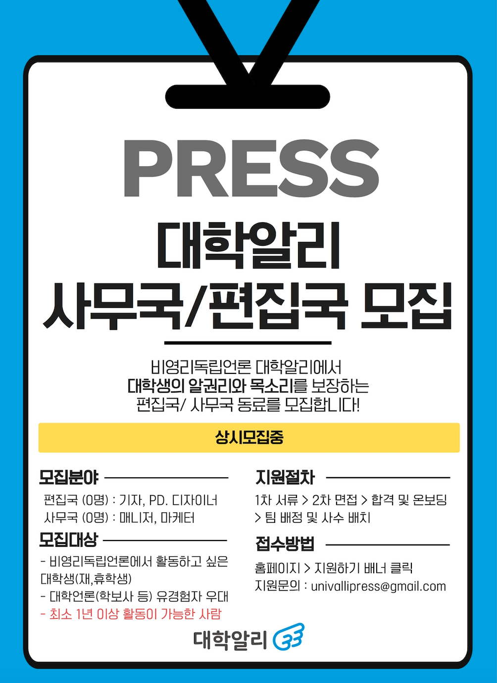 <대학알리>는 대학생의 알 권리와 목소리를 보장하는 비영리독립언론입니다. 학교에 소속된 학보사라는 한계를 넘어 대학으로부터 자유로운 편집권을 가지고 언론자유를 실현하기 위해 창간되었으며, 보다 자주적이고 건강한 대학 공동체를 위한 콘텐츠(기사, 영상 등)를 발행합니다.