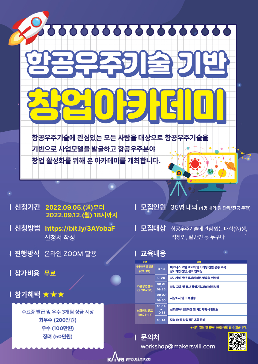 ○ 행사명 2022 항공우주기술 기반 창업아카데미 ○ 행사개요 - 항공우주기술에 관심있는 모든 사람을 대상으로 항공우주기술을 기반으로 사업모델을 발굴하고 항공우주분야 창업 활성화를 위해 본 아카데미를 개최합니다. ○ 대상: 항공우주 기술에 관심있는 누구나 (대학(원)생, 직장인, 주부 등) ○ 접수기간: 2022.09.05(월) \~ 2022.10.03.(월) 18시까지 ○ 참가비 : 무료 ○ 행사일정 및 장소 - 행사 일정 : 2022.10.05(수) \~ 2022.10.28(금) - 행사 장소 : 온라인 zoom ○ 행사내용 - 공통교육 및 진단 10.05(수) \~ 10.11(화) - 기본 창업 캠프 10.12(수) \~ 10.18(화) - 심화 창업 캠프 10.19(수) \~ 10.28(금) ※ 네트워킹 및 멘토링 일정의 경우 주어진 기간 내 개별적 일정 조율을 통해 진행 예정입니다. * 코로나-19 관계로 온라인행사로 진행됩니다. ○ 참가 혜택 - 수료증 - 최우수 (200만원), 우수 (100만원), 장려 (50만원) ○ 참가신청 - https://bit.ly/3AYobaF 신청서 작성 ○ 문의 - ☏ 1833-5107 / e-mail. workshop@makersvill.com