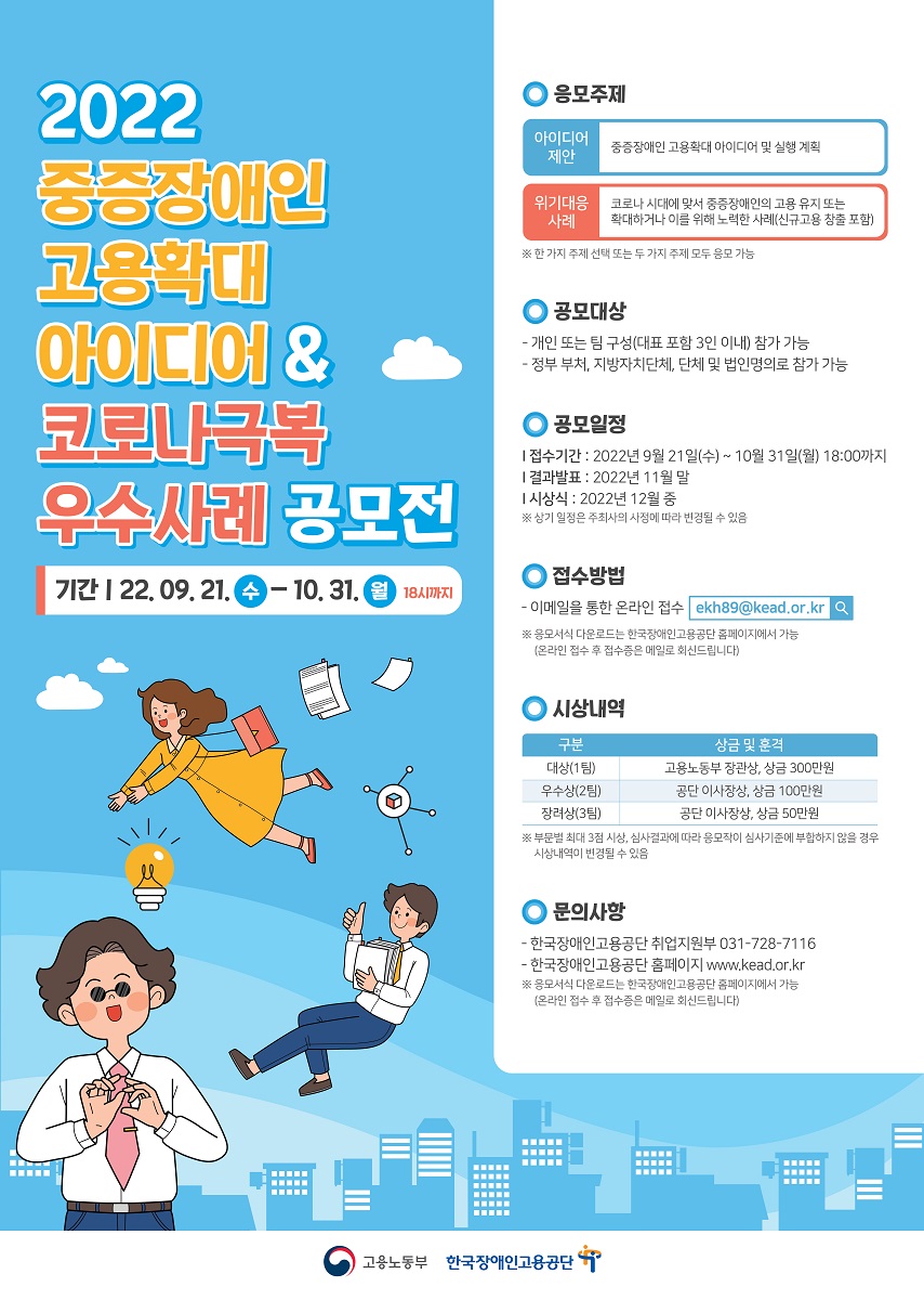 접수방법 - 이메일을 통한 온라인 접수 - ekh89@kead.or.kr ※ 응모서식 다운로드는 한국장애인고용공단 홈페이지에서 가능 (온라인 접수 후 접수증은 메일로 회신드립니다)