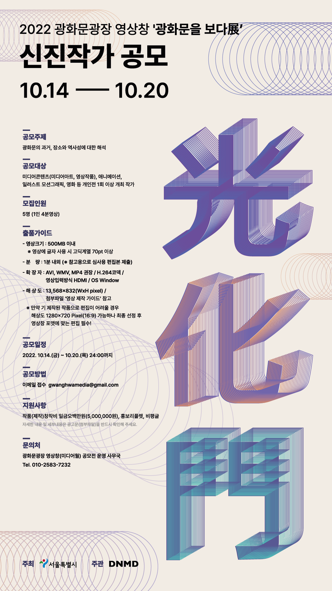 2022 광화문광장 영상창‘광화문을 보다展’신진작가 공모 <광화문광장 영상창>은 시민이 향유하고 공감할 수 있는 미디어아트와 영상콘텐츠 등 전자적 빛으로 이루어진 예술작품을 지속적으로 전시하는 미디어플랫폼으로, 공공미술의 영역을 확장하고 작가·시민과 함께 만들어가는 공유 가능한 미디어월 입니다. 2022년 1회 전시인 ‘광화문을 보다展’ 신진작가 공모는 역량 있는 순수미술가 및 미디어아티스트의 작품을 공모를 통해 선정하고 작가 5인의 작품을 선보여 작가의 작품세계 전반을 살펴보는 공공미술 전시입니다. 순수미술의 가능성과 공공미술의 확장을 보여 줄 ‘신진작가공모’를 다음과 같이 공고하오니 열정 있는 예술가분들의 많은 참여 바랍니다. ■ 공모명 2022 광화문광장 영상창 ‘광화문을 보다展’ 신진작가 공모 ■ 공모주제 광화문의 과거, 장소와 역사성에 대한 해석 ■ 공모일정 2022. 10.14.(금) \~ 10.20.(목) 24:00까지 ■ 응모자격 미디어콘텐츠(미디어아트, 영상작품), 애니메이션, 일러스트 모션그래픽, 영화 등 개인전 1회 이상 개최 작가 ■ 모집인원 5명 ( 1인 4분영상) ■ 접수방법 ‘서류‘ 및 ‘출품작'을 담당자 이메일로 제출 이메일 주소 : gwanghwamedia@gmail.com ※ 접수시 주의사항 이메일 제목 : ex) 2022 광화문 영상창 1회전시 공모전_이름 첨부파일명 : ex) 2022 광화문 영상창 1회전시 공모전_이름_작품명 혹은 서류명 ※ 제출서류 ① 참가신청서 1부 *서명필수,PDF파일 제출 ② 참가동의서 1부 *서명필수,PDF파일 제출 ③ 참가자 약력 1부 *PDF파일 제출 ④ 전시계획 요약서 1부(1\~2장) *PDF파일 제출 ⑤ 전시계획안 1부(가로형 A4 10매 이내, PDF파일 또는 PPT파일) *자유서식,PDF파일 제출 *제출서류 누락 시 접수 불가합니다.(하단 첨부파일 참조) ■ 출품작 규격 (동영상) - 영상크기 : 500MB 이내 ※ 영상에 글자 사용 시 고딕계열 70pt 이상 - 분 량 : 1분 내외 (※ 참고용으로 심사용 편집본 제출) - 확 장 자 : AVI, WMV, MP4 권장 / H.264코덱 / 영상입력방식 HDMI / OS Window - 해 상 도 : 13,568x832(WxH pixel) / 첨부파일 ‘영상 제작 가이드’ 참고 ※ 만약 기 제작된 작품으로 편집이 어려울 경우 해상도 1280×720 Pixel(16:9) 가능하나 최종 선정 후 영상창 포맷에 맞는 편집 필수! ■ 심사 및 발표일정 2022.10.22 \~10.24(예정) 홈페이지 및 개별통보 예정 *심사일정은 상황에 따라 변동될 수 있음. ■ 지원사항 작품(제작)창작비 오백만원(5,000,000원), 홍보리플렛, 비평글 *상금은 세액 공제 후 지급 자세한 내용 및 세부내용은 공고문(첨부파일)을 반드시 확인해 주세요.. ※ 첨부파일의 유의사항을 위반할 경우, 작품을 심사대상에서 제외할 수 있고 당선 후에라도 위반사항이 확인될 시 선정이 취소되며 상금을 반환할 수 있음을 양지하여 주시기 바랍니다. ■ 문의처 광화문광장 영상창(미디어월) 공모전 운영 사무국 Tel. 010-2583-7232