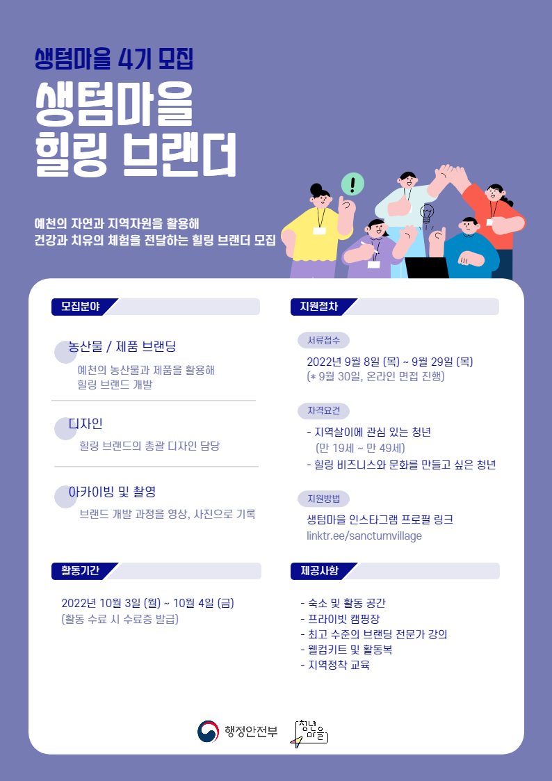 [참여자 조건] * 지역살이이 관심 있는 만 19세 \~ 만 49세 청년 (예천군 청년 기준) * 힐링 비즈니스에 관심 있는 청년 * 힐링문화로 새로운 삶을 만들어 보고 싶은 청년