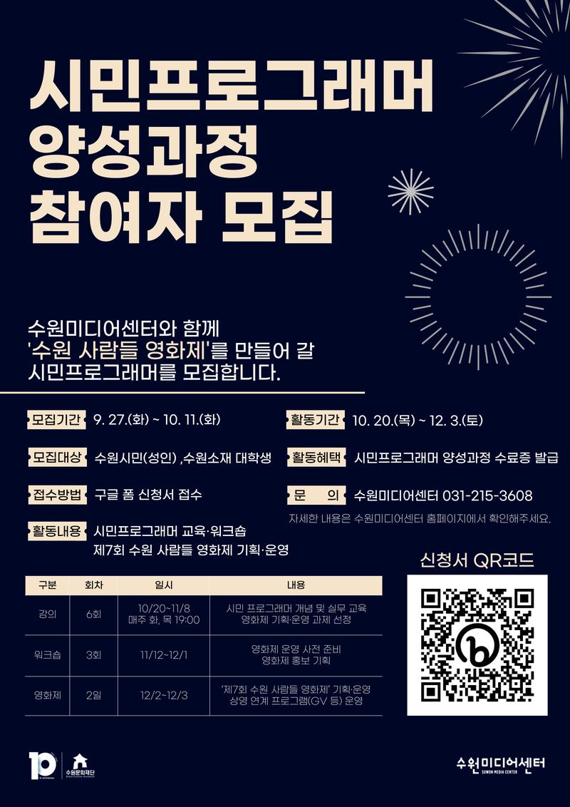 수원문화재단 수원미디어센터에서는 수원시민의 능동적인 영화 문화 생산·향유 활동을 지원하기 위해 「시민프로그래머 양성과정」을 추진하고 있습니다. 이와 관련하여 수원미디어센터와 함께 ‘제7회 수원 사람들 영화제’를 만들어 갈 시민프로그래머를 모집합니다. 시민 여러분의 많은 관심과 참여 부탁드립니다.