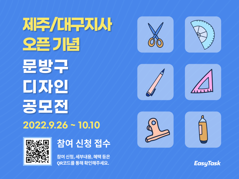 ○ 공모개요 -안녕하세요! 당신의 시간제 직원, 이지태스크입니다. 전국에 계신 문방구디자인 장인들을 대상으로 공모전을 열였으니 많은 참여 바랍니다. ○ 공모주제 -1)제주/대구 지역의 특색이 드러나는 디자인(예. 제주:귤/대구:사과) -2)기타 이지태스크를 떠올릴 수 있는 디자인 ○ 기간 및 일정 -접수기간: 2022.09.26\~10.10(월)까지 ○ 지원자격 - 이지태스크 회원이면 누구나 참여 가능 ○ 출품규격 - 공모 형식 · jpg 파일 압축파일 zip으로 제출 · 파일명:문방구 응모분야 이름 휴대전화 뒷자리4자리 (예. 문방구_스티커_이지태_7777) ※ 수상작에 한해 실제 굿즈 제작이 가능한 원본파일( ai,psd 등) - 필수사항 · 디자인에 이지태스크 로고 필수 삽입 · 로고 사용 규정에 맞게 사용 ○ 제출서류 -구글신청서 작성 및 이메일 접수(marketing@easytask.co.kr) ○ 심사기준 -공모일정, 발표 및 시상 시기는 사정에 따라 변경될 수 있으며 심사 내용은 공개하지 않습니다. -응모작품 수, 심사 결과에 따라 시상 작품 수가 조정되거나 수상작이 없을 수 있습니다. -수상자의 잘못된 정보 입력으로 인한 누락, 부재 등의 경우 수상 결정 후에도 수상내역(시상금 등) 재지급은 불가합니다. ○ 시상내역 -대상 (1명) : 현금 50만원 -최우수상 (1명) : 현금 30만원 -우수상 (1명) : 현금 10만원 ○ 유의사항 -5만원 초과 상금은 소득세법에 따라 총 금액의 4.4%가 공제된 후 지급됩니다. ○ 문의 - 이지태스크 대표번호 ☏ 1833-6212 - 카카오채널 이지태스크 바로가기