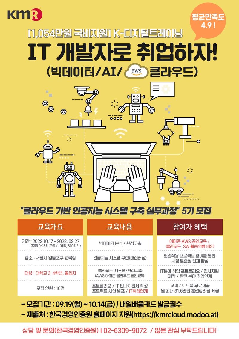 [교육개요] 1. 교육명 : 클라우드 기반 인공지능 시스템 구축실무과정 2. 교육대상 : IT/SW 개발자 취업을 희망하는 대학교 3\~4학년\, 졸업(예정)자 / 정원 24명\, 취업준비생 등 3. 교육기간 : 2022년 10월 17일(월) \~ 2023년 02월 27일(월) / 101일 800시간 / 09\~18시\, 1일 8시간 4. 교육장소 : 한국경영인증원 교육장(서울시 영등포구 경인로 775, 212호) 5. 교육비 : 전액 무료(국고지원) / 1인 교육비용 1,054만원 상당(내일배움카드 발급 필수) 6. 모집기간 : 고용노동부 전산 등록으로 인한 마감기한 엄수 - 5기 : 2022년 09월 26일(월)\~ 2022년 10월 14일(금) ※ 국민내일배움카드 발급이 2주가 걸리므로 반드시 교육시작 최소 2주전 신청요망 7. 참여자 혜택 ① 수업의 50% 이상을 반영하여 현업에 적용할 프로젝트 활동 실시 ⇒ 기업/시장분석, 역량강화 ② 현직 SW 기술전문가의 프로젝트 참여 멘토링 진행 ③ 본 프로그램 수료생 대상 채용 우대 기업으로의 연계지원 ④ 취업을 위한 진로/취업상담 멘토링 제공 ⑤ 매월 훈련장려금 최대 31.6만원 지급