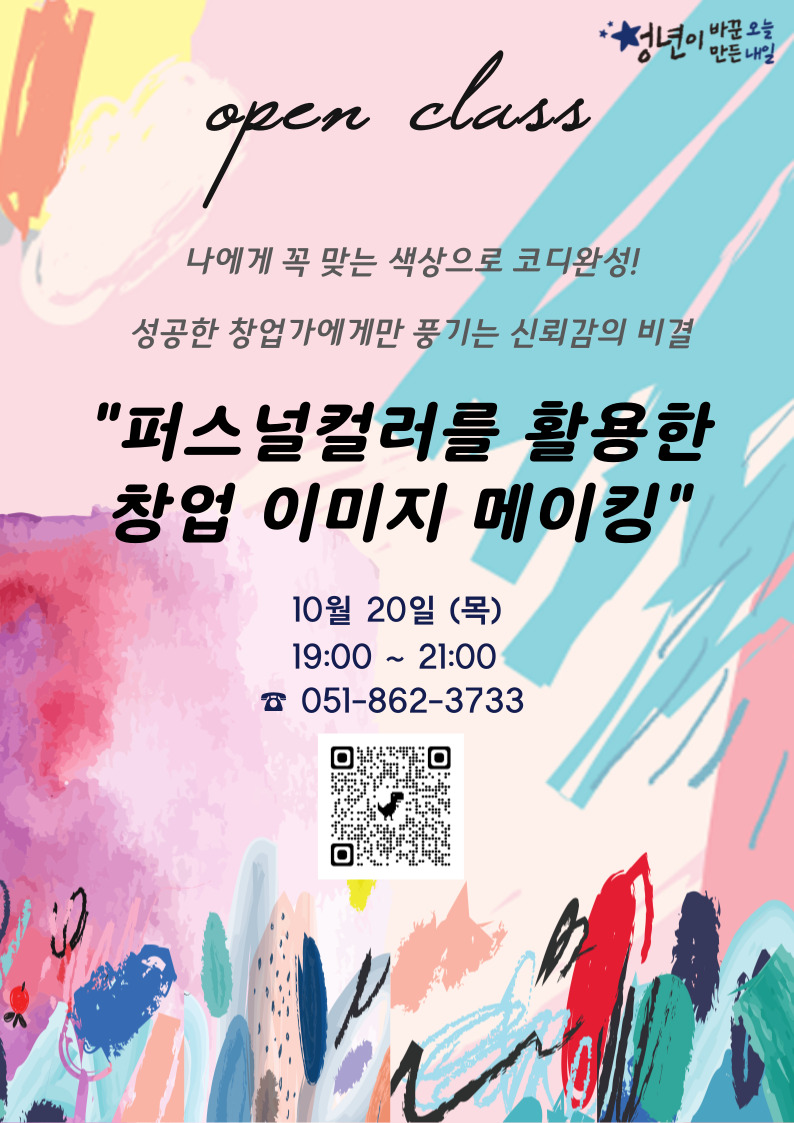 안녕하세요. 연제청년창업나래센터입니다. <10월 오픈클래스>관련 프로그램 안내드립니다! 이번 강의 또한 온·오프라인 동시 진행될 예정이며 오프라인 수업 장소는 연제청년창업나래센터 내 회의실입니다. 10월 오픈클래스 1회차 강의 나에게 꼭 맞는 색상으로 코디완성! 성공한 창업가에게만 풍기는 신뢰감의 비결 "퍼스널 컬러를 활용한 창업 이미지메이킹" -일정 : 10월 20일 목요일 19:00 (2H) -대상 : 창업에 관심 있는 누구나 -접수 : 전화 또는 구글폼 작성 https://forms.gle/GFUSq2fnGi2FQ9C78 -문의 : 051-862-3733