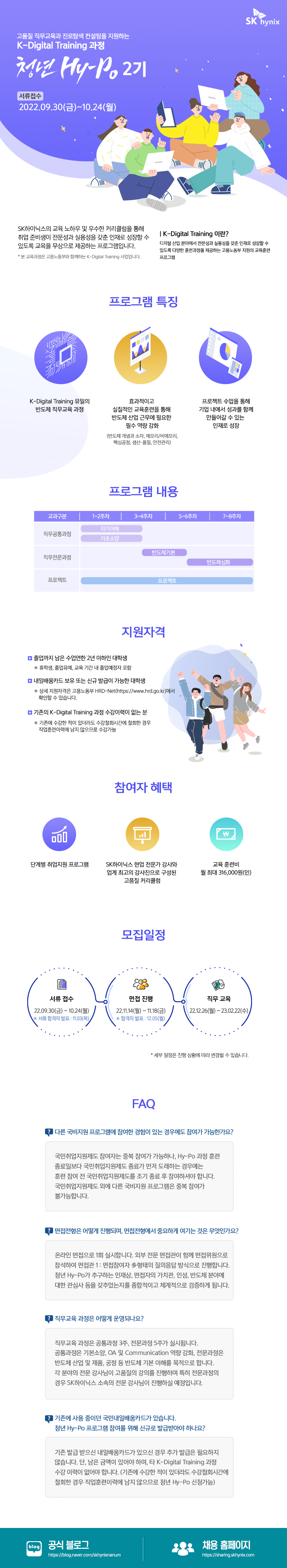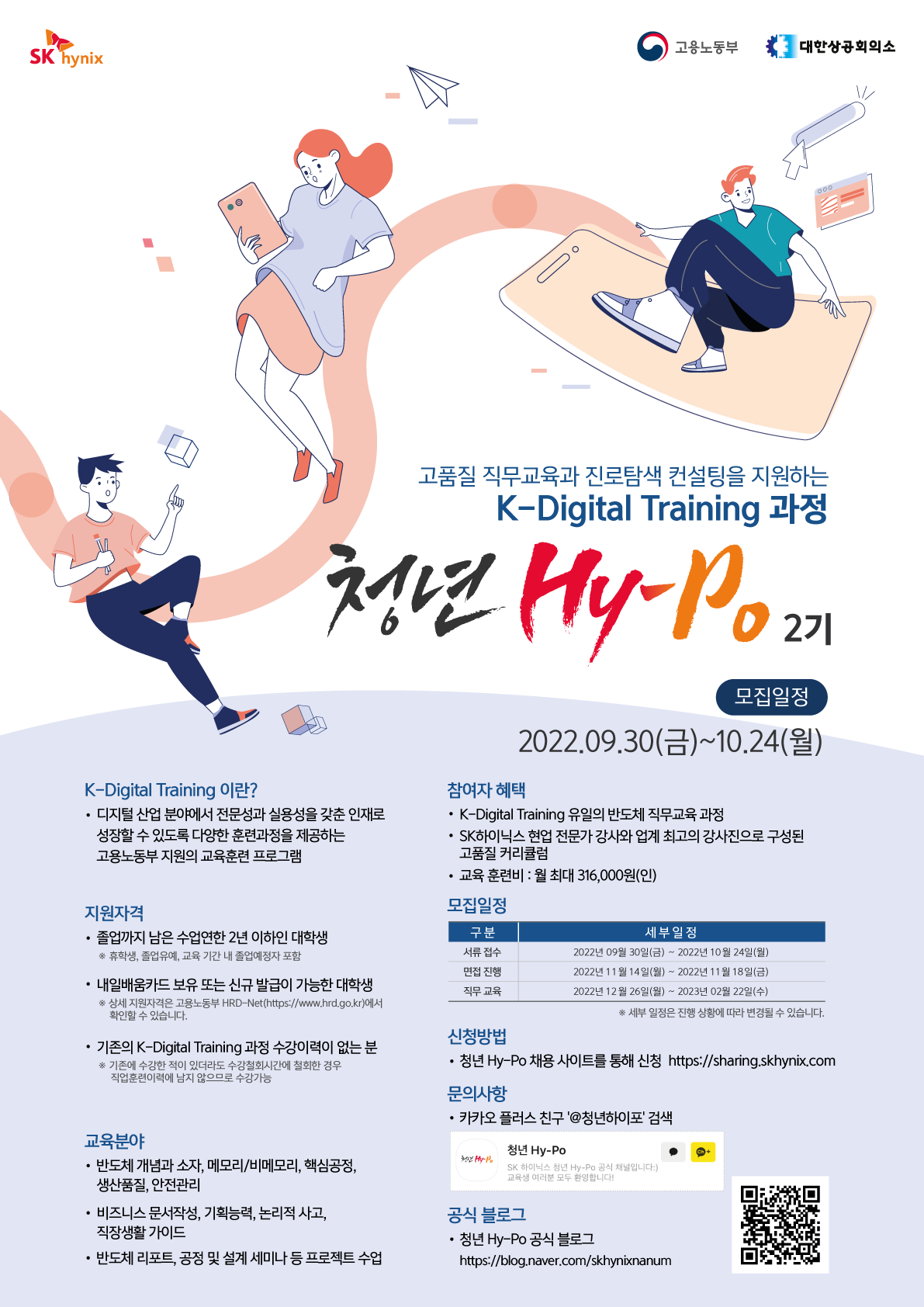 청년 Hy-Po는 SK하이닉스와 고용노동부와 함께하는 K-Digital Training 과정으로 고품질 반도체 직무교육과 진로탐색 컨설팅을 지원하는 프로그램입니다. 청년 Hy-Po는 반도체 산업 근무에 필요한 필수 직무역량을 강화하고 전문성과 실용성을 갖춘 인재로 성장할 수 있도록 반도체 기초·전문교육을 제공합니다.