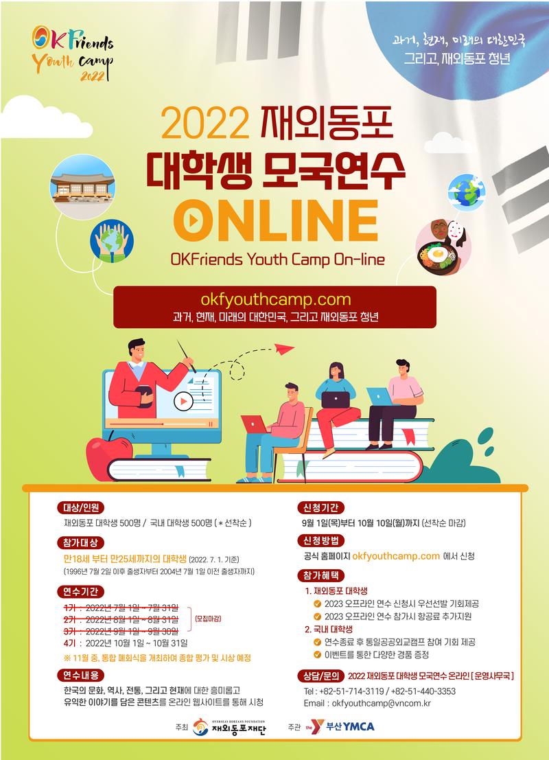 ■ 연수문의 : 2022 재외동포대학생모국연수(온라인) 운영사무국 Tel : 051-714-3119 / 051-440-3353 Email : okfyouthcamp@vncom.kr
