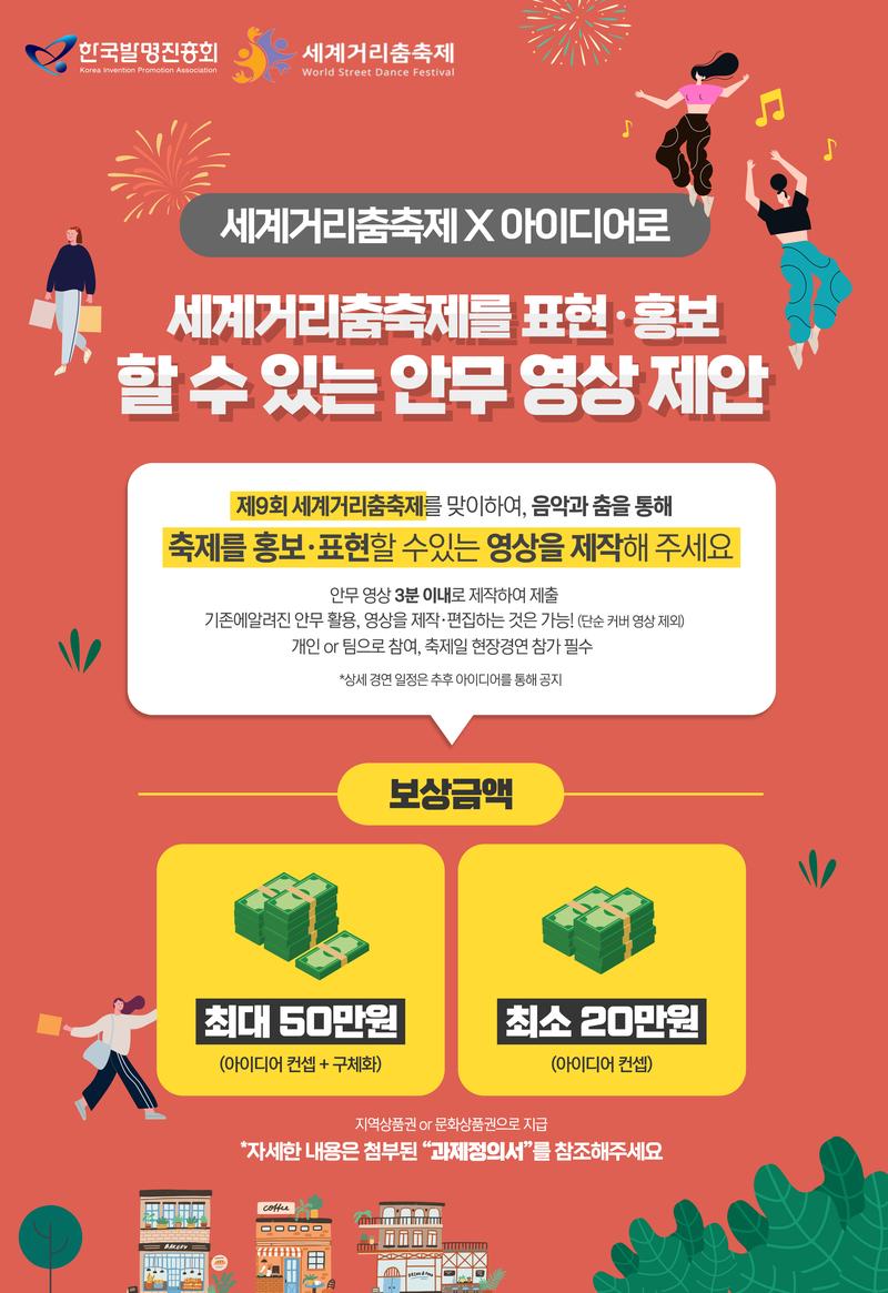 ▶ 시상내역 총 100만원 상당 50만원, 30만원, 20만원/ 각1건 해당 금액에 준하는 지역상품권 or 문화상품권 지급 ▶ 공모분야 세계거리춤축제를 표현할 수 있는 안무 영상 제안 ▶ 접수법 https://www.ipmarket.or.kr/idearo/service/idc/chlg/idcDetail.do?idcId=KPOIP_IDC_20220914053956063 ▶ 행사목적 - 주민주도형 축제로서 동대문구 지역경제 활성화 발판 마련 - ‘춤’을 모티브로 한 대중 참여형 축제로 공공성 확보 - 새로운 거리 문화 창출을 통한 관강 상품 개발 - 세계거리춤축제만의 경쟁력 있는 콘텐츠 제작, 세계적인 축제 발판 마련 - 춤을 통해 세대 간 소통과 공감을 이끄는 건전한 여가문화 도모 ▶ 제안요건 - 세계거리춤축제를 홍보·표현할 수 있는 안무영상을 3분 이내로 제작하여 제출해 주시기 바랍니다. - 영상제출은 유튜브에 등록한 후 해당 링크를 제안서에 표기 * 저작권 보호 콘텐츠를 위하여 '저작권 소유자가 수익을 창출함'이라는 옵션이 설정 - 기존에 알려진 안무를 활용하여 영상을 제작·편집하는 것은 포함하나, 단순 커버 영상은 제외됩니다. - 개인 또는 팀으로 제안 가능하며, 축제일에 현장경연 참가 가능한 경우 제출해 주시기 바랍니다. ▶ 문의처 대표전화 : 02-3459-2809/2728 E-mail : idea@kipa.org