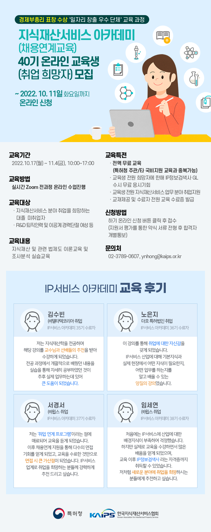 - 특허청의 주관으로 한국지식재산서비스협회에서 진행하는 무료 교육인 40기 "IP서비스 아카데미"입니다.