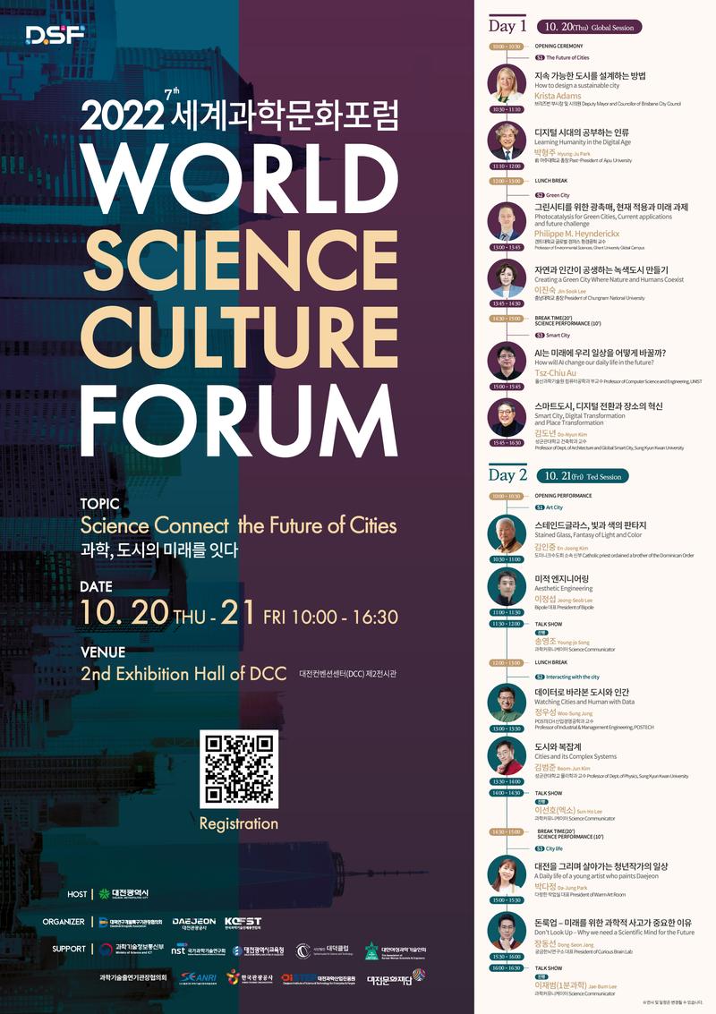 ○ 행사명: 제7회 세계과학문화포럼 ○ 행사일자: 2022년 10월 20일(목) \~ 21일(금) 10:00-16:30 ○ 장소: 대전컨벤션센터(DCC) 제2전시장 ○ 주제: 과학, 도시의 미래를 잇다 ○ 홈페이지: https://www.djsf.kr/wscf