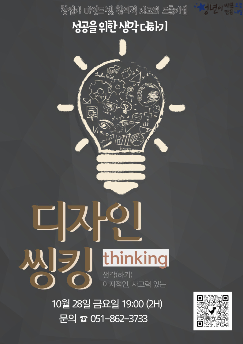 안녕하세요. 연제청년창업나래센터입니다. <10월 오픈클래스>관련 프로그램 안내드립니다! 이번 강의 또한 온·오프라인 동시 진행될 예정이며 오프라인 수업 장소는 연제청년창업나래센터 내 회의실입니다. 10월 오픈클래스 2회차 강의 성공을 위한 생각 더하기! 창업가의 마인드셋, 창의적 사고와 도출기법 "아이디어에 날개를 달아줄 디자인씽킹" -일정 : 10월 28일 금요일 19:00 (2H) -대상 : 창업에 관심 있는 누구나 -접수 : 전화 또는 구글폼 작성 https://forms.gle/XMuL47LuBuiwDSW4A -문의 : 051-862-3733