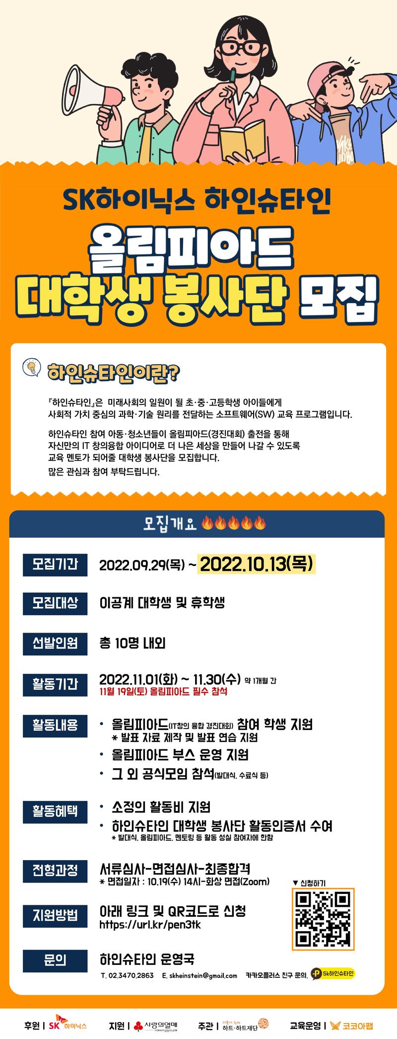 SK하이닉스 후원으로 실시되는 하인슈타인 올림피아드(경진대회) 대학생 봉사단을 모집합니다. 많은 참여 부탁드립니다. ㅁ 응모자격 : 이공계 대학생 및 휴학생