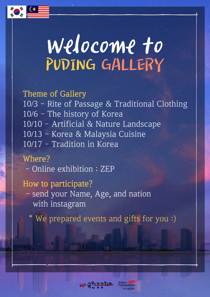 저희 PUDING GALLERY는 "2022 KF국민공공외교 프로젝트"의 일환으로, PKNU 대학관과 문화 전시회를 활용하여 각 국가 간의 문화교류 증진을 목표로 활동하고 있습니다! 전시회별로 진행되는 이벤트 참여하셔서 상품도 꼭 받아 가세요! 🥰