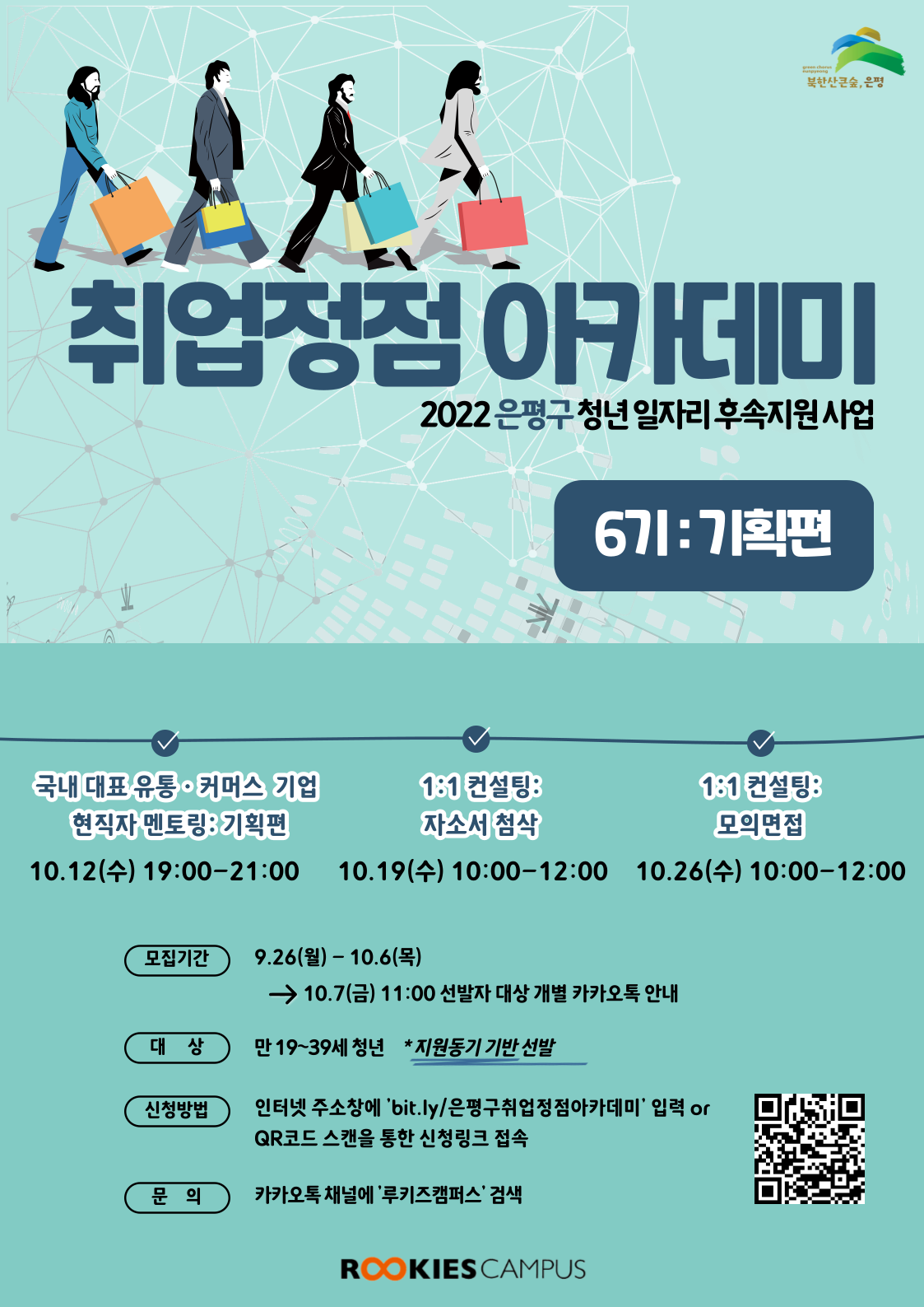 국내 대표 유통 커머스 플랫폼 현직자가 들려주는 기획 직무 이야기에 이어 **기획 직무 맞춤 1:1 자소서 첨삭 & 모의면접까지. 소그룹 맞춤형 프로그램, 은평구 취업정점 아카데미 6기 OPEN!