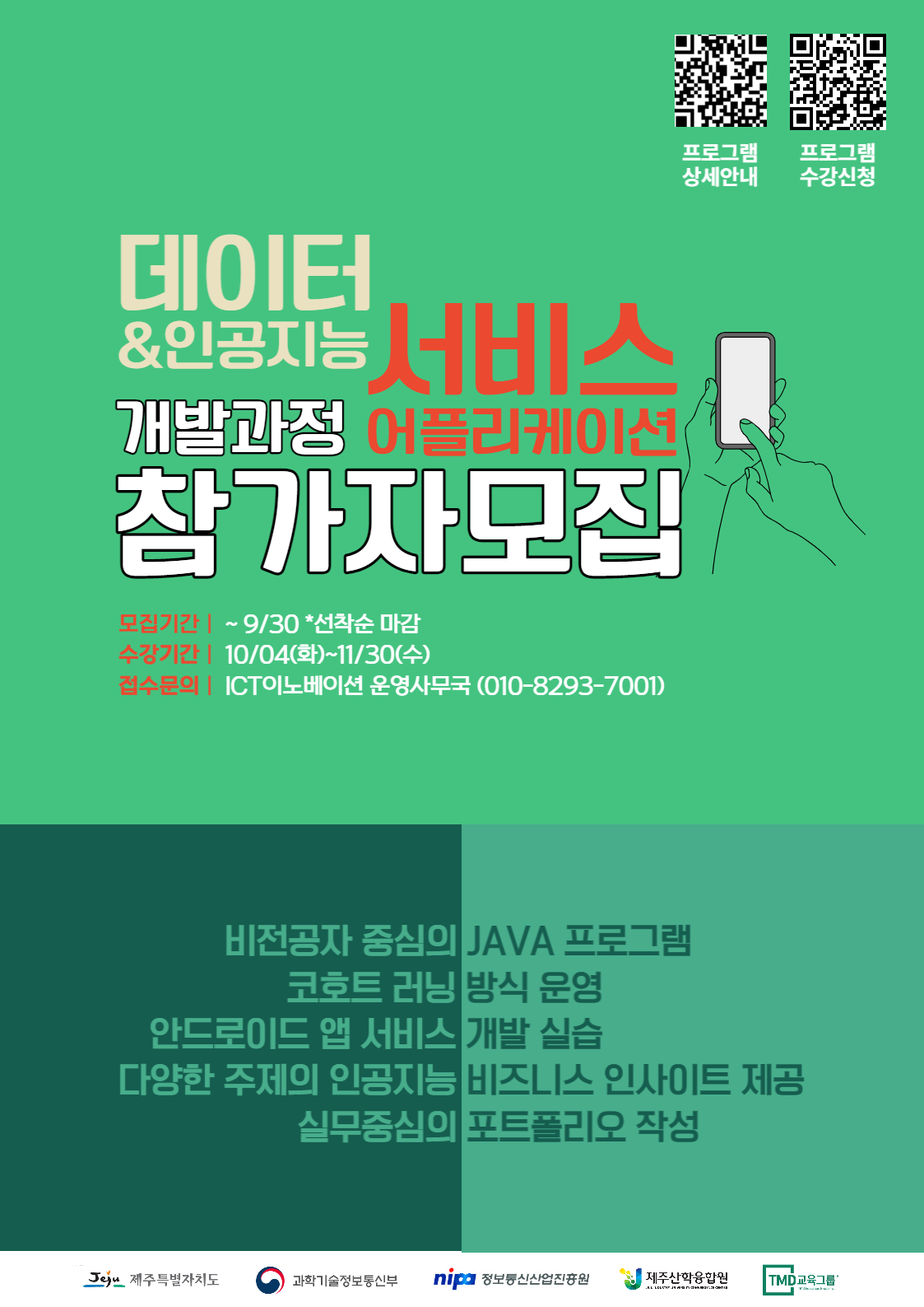 데이터 및 인공지능 활용 서비스 어플리케이션 개발 과정(\~선착순 마감) 1. 주관/주최 티엠디교육그룹/제주산학융합원 2. 일시/장소 - 모집기간 : 2022.09.13(화) \~ 마감시까지 - 교육기간 : 2022.10.04(화) \~ 11.30(수) - 교육장소 : 온라인중심(오프라인 주 1회\, 제주산학융합원) 3. 대상 제주지역 거주자 또는 제주지역 재직자 4. 내용 (활동/교육내용/혜택 등) JAVA프로그램을 활용한 안드로이드앱 서비스 개발, 포트폴리오작성, BM(비즈니스모델)특강 5. 문의처 ICT이노베이션스퀘어 운영진 010-8293-7001 6. 출처/링크(아래 사진 클릭) -상세안내: https://jeju-ict.notion.site/App-9-8-2b35c0e53b0f4b1e9bdc196c651ddc48 -신청링크: https://forms.gle/tBsRvYQZmEtrWANY7