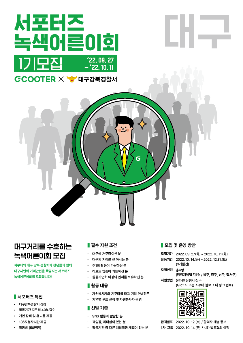 안녕하세요! 지쿠터입니다. 대한민국 PM 업계 1위 업체 지쿠터에서 대구 거리를 수호하는 녹색어른이회를 모집합니다! 길거리에서 어린이들의 안전을 수호하는 녹색어머니회와 같이 거리 안전을 수호하는 녹색어른이회! 필수 지원 조건과 활동 내용을 알려드리겠습니다. 필수 지원 조건 : 대구에 거주 중이시고 원동기 면허 이상을 보유하신 분! 킥보드 탑승과 주 1회 활동이 가능하신 분! 활동 내용 : 자원봉사자 분들과 함께 대구 시내를 다니며 거리에 있는 PM(킥보드, 전기자전거) 정리정돈! 거리의 안전을 위협하는 요소 관리 및 해결!