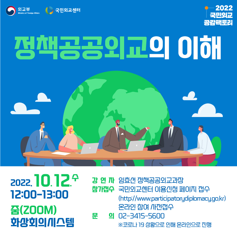 외교부는 10월 12일(수) 12:00-13:00 “정책공공외교의 이해"를 주제로 국민외교 공감팩토리를 개최할 예정입니다. 이번 행사는 코로나19 상황으로 인해 온라인으로 진행될 예정입니다. 국민 여러분의 많은 관심과 참여를 부탁드립니다.