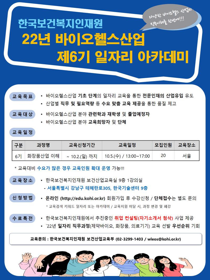 한국보건복지인재원은 보건복지부 산하 준정부기관으로서 바이오헬스 신성장동력 육성을 통한 일자리 창출 사업에 근거하여 취업준비자 및 예비 진출자를 위한 직무교육을 실시하고 있습니다.