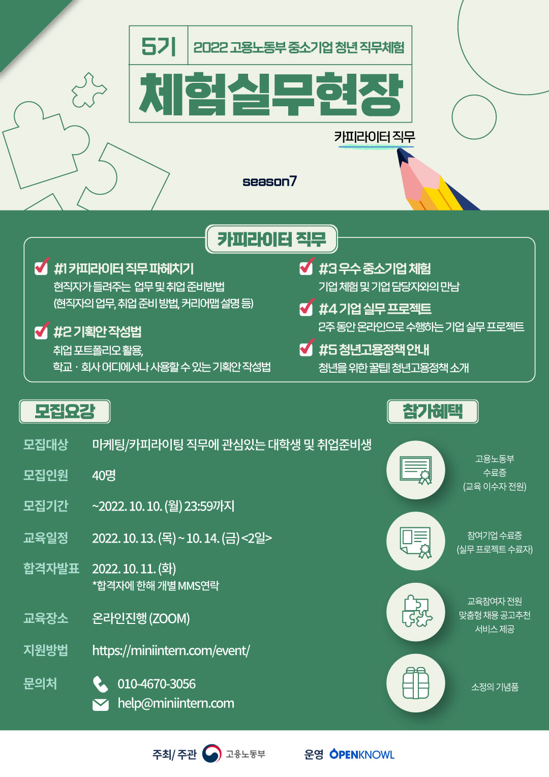 ▶ 주최사/ 활동명 (주)오픈놀 / 체험실무현장 5기 (마케팅/카피라이팅 직무 편) ▶활동 내용 1) 마케팅 직무 파헤치기 - 현직자에게 듣는 마케팅 업무 및 회사 생활 소개\, 취업 준비 꿀팁! 2) 기획안 작성법 - 학교\, 회사 어디서나 활용할 수 있는 기획안 작성법 3) 우수 중소기업 소개 (기업명: (주)플레이콕) - 기업 소개 및 실무 프로젝트 수행을 위한 과제 소개 (Q&A포함) 4) 기업 실무 프로젝트 - 온라인으로 진행하는 기업 실무 프로젝트 (온라인) ※프로젝트명: 스포츠콕의 액티비티를 알릴 수 있는 SNS 광고용 카피라이팅 제안 5) 청년 고용 정책 안내 - 청년을 위한 꿀팁! 청년 고용 정책 소개 ▶모집 기간 모집 마감 : \~ 2022.10.10.(월)까지 합격자 발표 : 2022.10.11.(화) <합격자에 한하여 개별 MMS연락> ▶모집 인원 40명 ▶모집 대상 마케팅/카피라이팅 직무에 관심 있는 대학생 및 취업 준비생 ▶참가 비용 무료 ▶교육 장소 온라인 진행(Zoom활용) ▶교육 일시 2022.10.13.(목)\~ 2022.10.14.(금) <무박 2일 교육> ▶활동 혜택 - 고용노동부 수료증(2일 교육 수료자) - 참가 기업 수료증(실무 프로젝트 수료자) - 카피라이팅 직무에 대한 실무 프로젝트 경험 - 지원 사업 안내 및 연계 - 소정의 기념품 ▶지원 방법 온라인 신청: https://bit.ly/3dPh0cn ▶문의처** 전화 : 010-4670-3056 메일 : help@miniintern.com