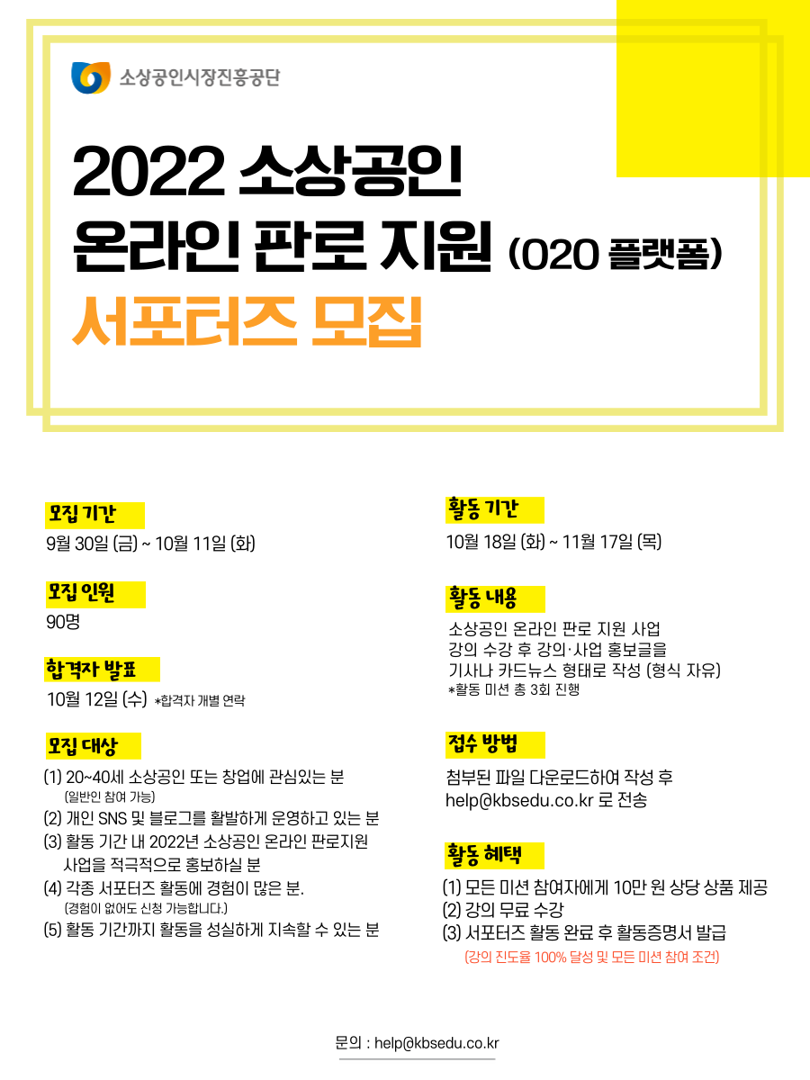 4. 모집대상 : (1) 20\~40세 소상공인 또는 창업에 관심 있는 분 (일반인 참여 가능) (2) 개인 SNS 및 블로그를 활발하게 운영하고 있는 분 (3) 활동 기간 내 2022년 소상공인 온라인 판로 지원 사업을 적극적으로 홍보하실 분 (4) 각종 서포터즈 활동에 경험이 많은 분 (경험이 없어도 신청 가능합니다.) (5) 활동 기간까지 활동을 성실하게 지속 할 수 있는 분