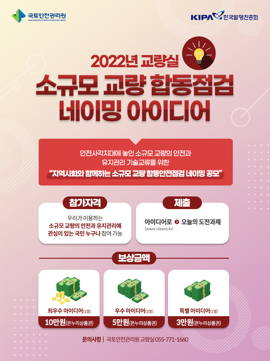 ▶ 행사목적 ㅇ 국토안전관리원은 「시설물의 안전 및 유지관리에 관한 특별법」(약칭: 시설물안전법)에 따라 국가 주요시설물의 정밀안전진단 실시, 기술개발·보급 등의 고유업무와 더불어, ㅇ 지역사회의 안전확보를 위해 시설물안전법으로 지정된 3종 교량과 종외 교량* 등 소규모 교량 시설물을 대상으로 지자체·공공기관과 합동안전점검을 수행하고 있습니다. *종외 교량시설물: 「시설물의 안전 및 유지관리에 관한 특별법」 시행령 별표 1 ‘제1종시설물 및 제2종시설물의 종류’, 별표 1의2 ‘제3종시설물의 범위’ 에 해당되지 않는 교량 시설물 ㅇ 최근 3년간 지역사회의 소규모 교량 30개소(경남 하동군('20년), 전남 순천시('21년), 경남 남해군('22년))와 국립공원관리공단·지자체 내 출렁다리 10개소를 점검하여 시설물의 안전을 확인하였고, 관리원이 보유한 첨단기술(3D스캐너, 드론)을 도입하여 지역사회와 기술을 교류하는 등의 공공서비스를 수행하였습니다. ㅇ 이러한, 안전점검 서비스를 국토안전관리원 교량실의 실행과제로 자리매김하고, 대국민 홍보를 위한 브랜드화의 일환으로, “소규모 교량 시설물 합동안전점검” 네이밍 공모를 실시하고자 합니다. ▶ 제안요건 o 아이디어 제안 양식 - 첨부된 양식*을 활용하여 아이디어를 등록해 주세요. o 관련 키워드를 참고해주시기 바랍니다. o 간단한 컨셉 아이디어도 환영합니다. o 아이디어 거래 제외 대상 - 타 공모전 수상작, 유사작으로 판명되거나 타인의 창작물을 표절, 복제한 경우 또는 타인의 지식재산권 침해가 발견된 경우 아이디어 거래 대상에서 제외됩니다. ▶ 문의처 - 한국발명진흥회 지식재산사업화팀 - TEL : 02-3459-2809 - EMAIL: idea@kipa.org *아이디어 플랫폼 ‘아이디어로‘(www.idearo.kr) 내 공공기관과 함께 하는 혁신 아이디어 공모전의 해당 과제 하단 댓글 문의