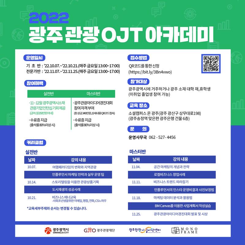 ■ 대회명 : 2022 광주 관광 OJT 아카데미 ■ 주최기관 : (재)광주관광재단 광주관광기업지원센터 ■ 운영일정 - 접수 기간 : 2022. 9. 19(월) \~ 2022. 10. 6(목) 참가자 선정 발표 : 2022. 10. 7(금) 교육 진행 :10월\~11월 아이디어 경진대회 및 수료식 : 22.11.25(금) 14:00\~17:00 ■ 참가부문 로컬크리에이터, 관광활성화 정책, 관광 상품의 개발 등 관광활성화 전략 ■ 참가대상 - 광주광역시에 거주하거나 광주 소재 대학의 재,휴학생 또는 미취업 졸업생 ■ 시상내역 대상 : 1개팀 / 상금 1,000,000원 최우수상 : 2개팀 / 상금 500,000원 우수상 : 3개팀 / 상금 300,000원 장려상 : 4개팀 / 상금 200,000원 ■ 접수처 : https://bit.ly/3Bn4vwo 또는 포스터 내 QR코드를 통해 신청서 작성 ■ 심사 기준 지역관련성, 협업체계, 창의성, 완성도, 출석률 ■ 문의 - PROJECT MANAGER : 062-527-4456