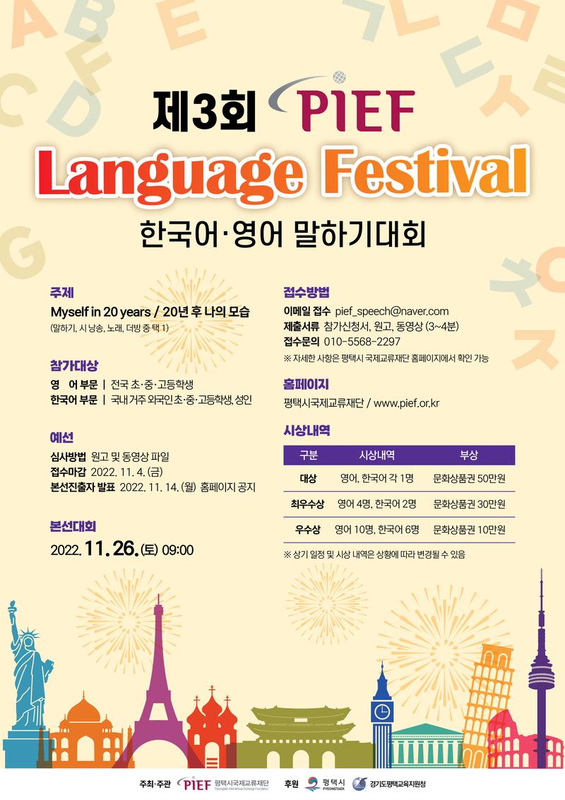 ○ 시상 내역 평택시장상, 경기도평택교육지원청교육장상, 국회의원상, 평택시국제교류재단이사장상 등 상장 및 부상 수여 예정 대상 - 한국어,영어 각 1명 (문화상품권 50만원) 최우수상 - 영어 4명, 한국어 2명 (문화상품권 30만원) 우수상 - 영어 10명, 한국어 6명 (문화상품권 10만원) ※상기 일정 및 시상 내역은 상황에 따라 변경될 수 있음