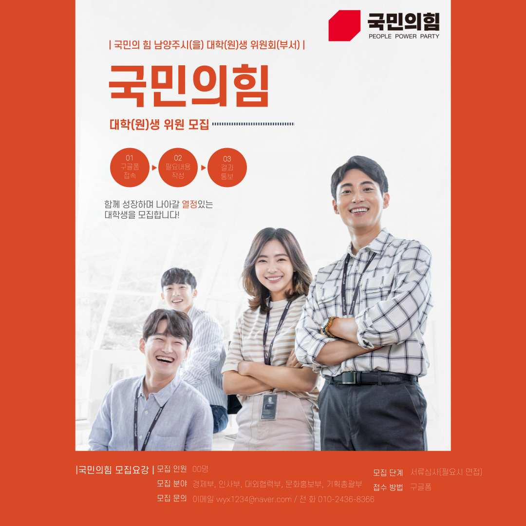 국민의힘 남양주시을(진접읍,오남읍,별내동, 별내면) 대학(원)생위원회와 함께 새로운 세상을 만들어 나갈 대학(원)생을 모집합니다. 정치에 관심 있는 남양주 거주 또는 남양주시에서 활동할 수 있는 대학(원)생이라면 누구든 참여할 수 있습니다. 내일을 준비하는 여러분이 세상을 바꿀 수 있습니다.