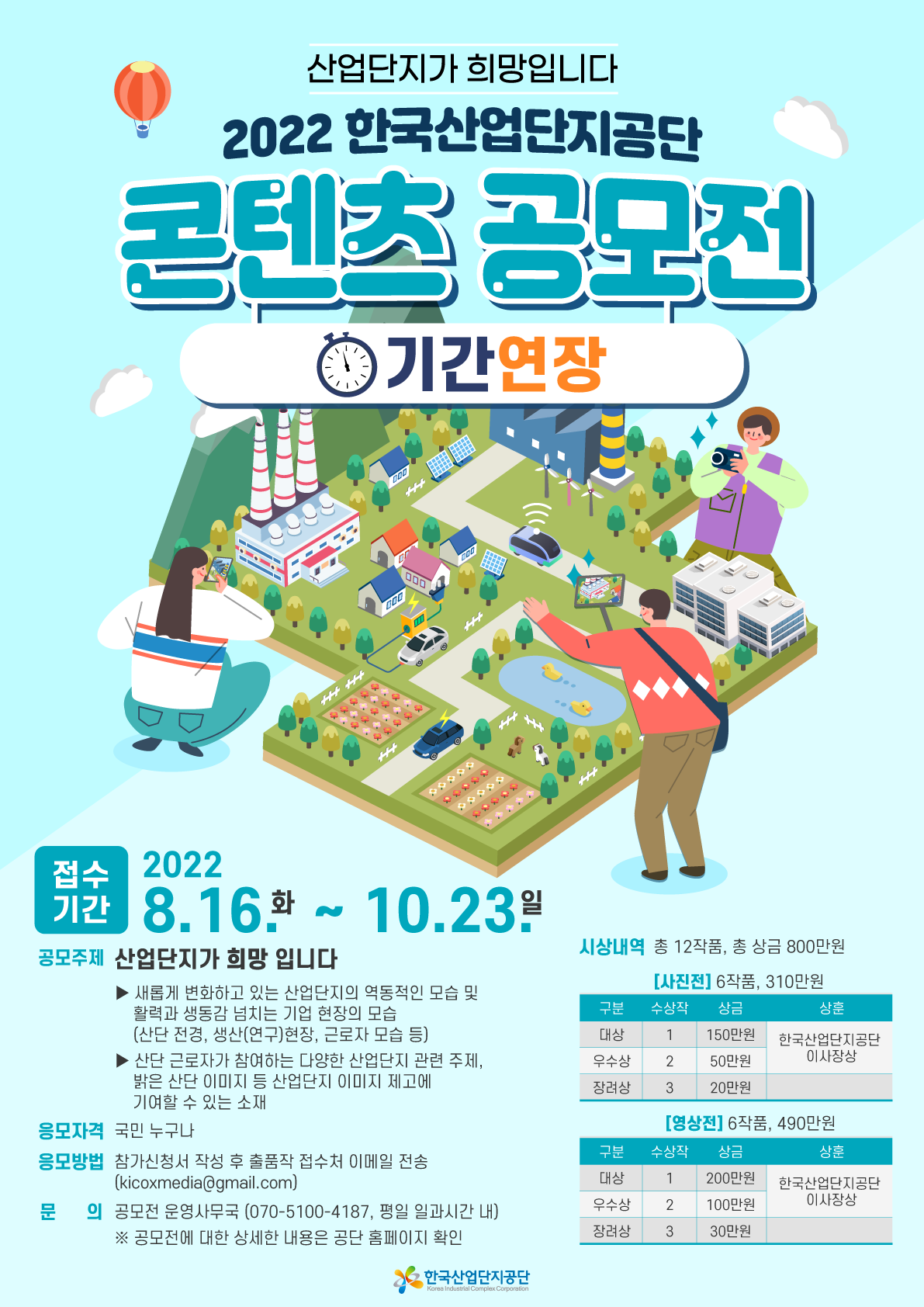 2. 공모서 접수 가. 제출방법 : 신청서류 작성하여 이메일 접수 ㅇ (신청서) 한국산업단지공단 홈페이지 (www.kicox.or.kr)) 또는 공식 블로그(https://blog.naver.com/kicox1964)) 다운로드 ㅇ (제출처) kicoxmedia@gmail.com / 2022.10.23.(일) 23시59분까지 도착 ※ 제출 시 파일명 및 이메일 제목: KICOX공모전_작품명_이름(제출날짜) 나. 제출서류 : 공모전 신청서, 유의사항, 개인정보 수집․이용․제공 동의서 각 1부 3. 심사기준 및 시상내역 가. 심사기준 : 주제적합성(30%)/표현성(20%)/완성도(30%)/흥미도(20%) ※ 동점 발생시 주제적합성, 표현성, 완성도, 흥미도 기준 고득점 순서대로 평가 나. 결과발표 : 2022. 11. 11(금) 홈페이지 및 SNS 채널 공고 다. 시상내역 : 한국산업단지공단 이사장상(6작품) 및 총상금 800만원 ㅇ 수상작은 한국산업단지공단 본사(대구)에서 시상식 예정(11.25(금)) ※ 세부 일정 및 시상식 장소 등은 변경될 수 있으며 수상자에게 개별 통보
