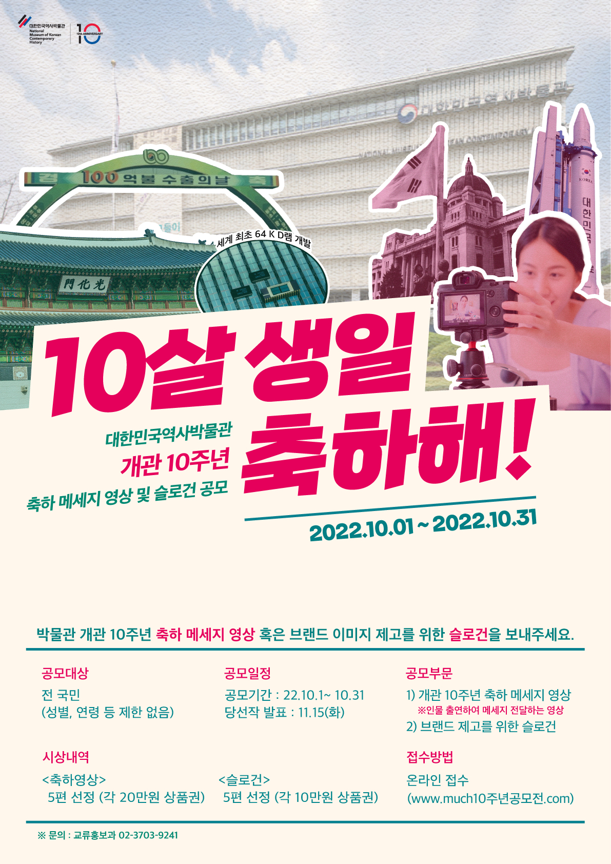 ● 공모주제 국민 여러분들의 축하 메시지 영상 및 박물관의 브랜드 이미지 제고를 위한 슬로건을 공모합니다
